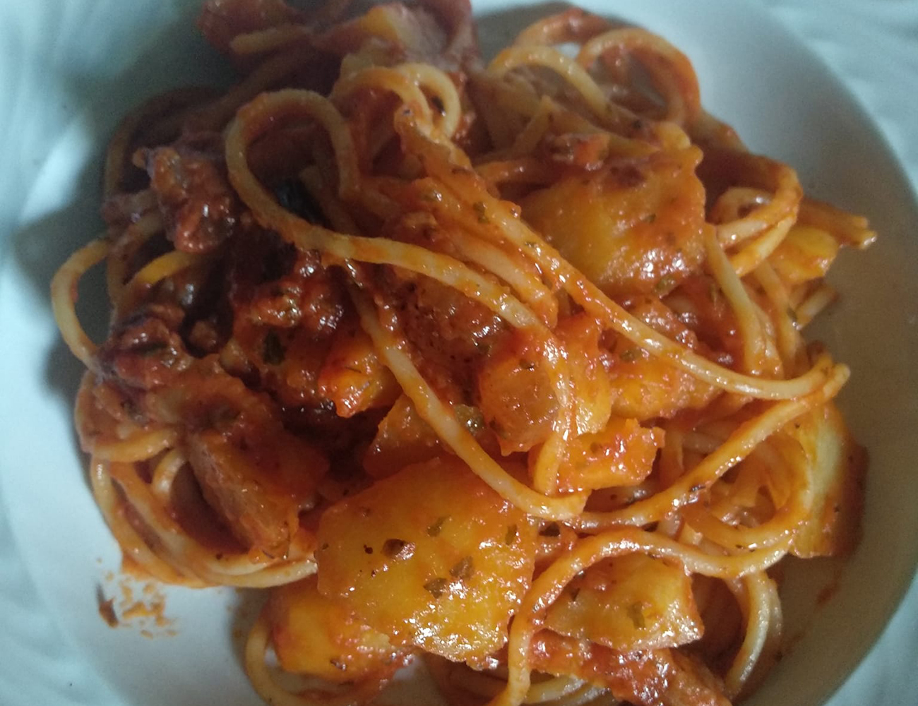 Coprite ancora e lasciate cuocere per altri 15 minuti. Intanto lessate la pasta in abbondante acqua bollente e salata. Scolatela quando è al dente e trasferitela subito nella padella con il condimento. Mescolate e lasciate riposare per qualche minuto, quindi completate con un giro di olio a crudo. Impiattate e completate con una spolverata di pecorino grattugiato. Se vi piace potete mantecare anche aggiungendo della provola tagliata a tocchetti. La vostra pasta con ragù di patate è pronta. Buon appetito.