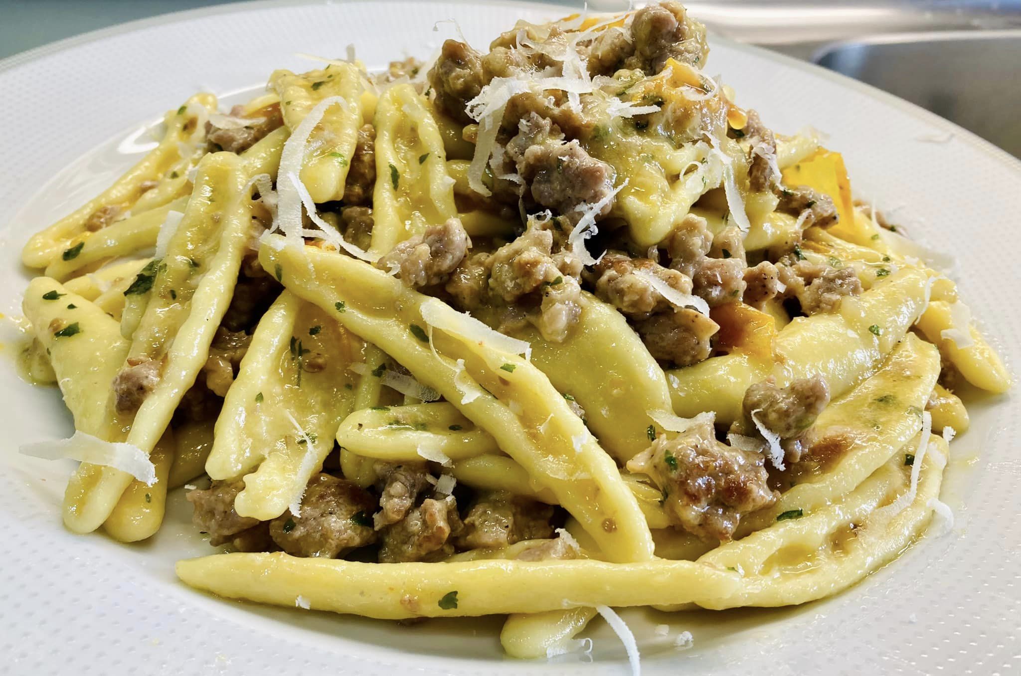 Pasta con salsiccia pomodorini gialli e provolone