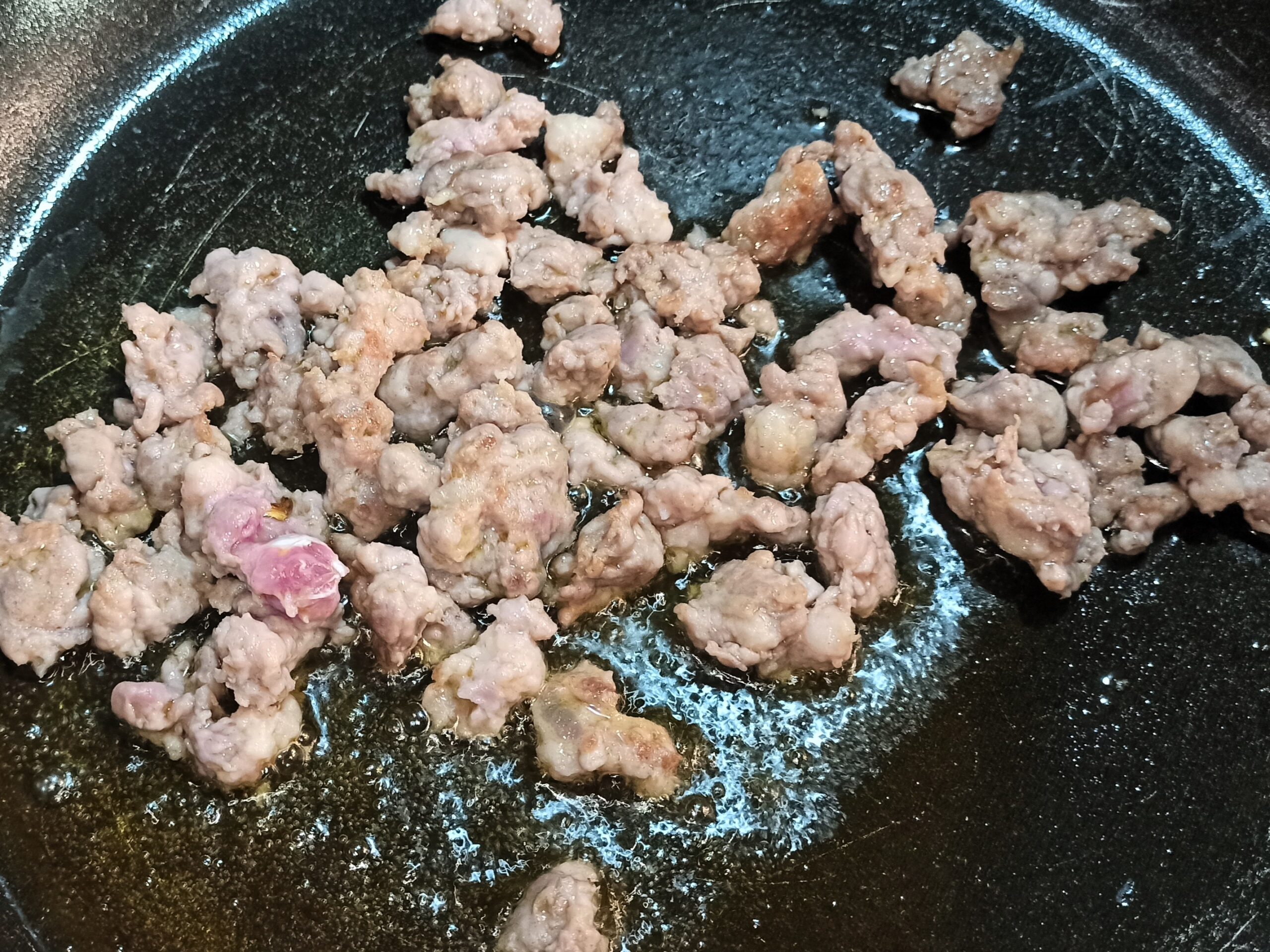 e fateli cuocere a fiamma vivace, a cottura ultimata regolate di sale, e mettete da parte in una ciotolina. Nello stesso olio cuocete la salsiccia, privata del budello e disgranata, sfumate con il vino bianco.