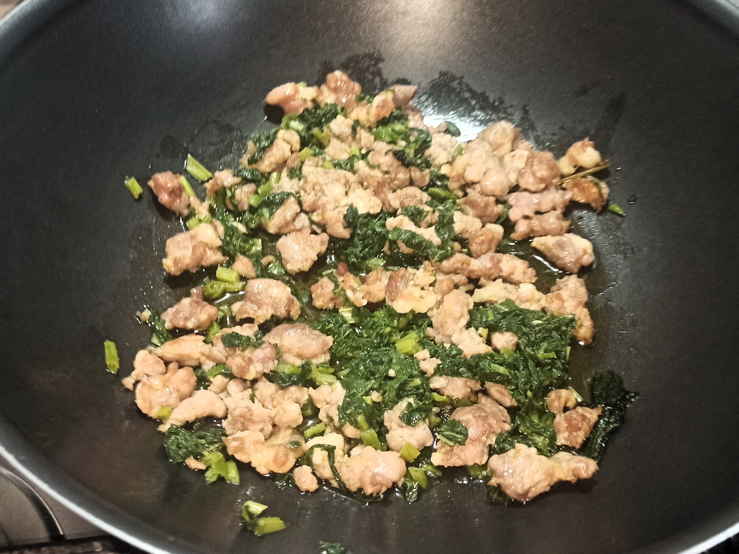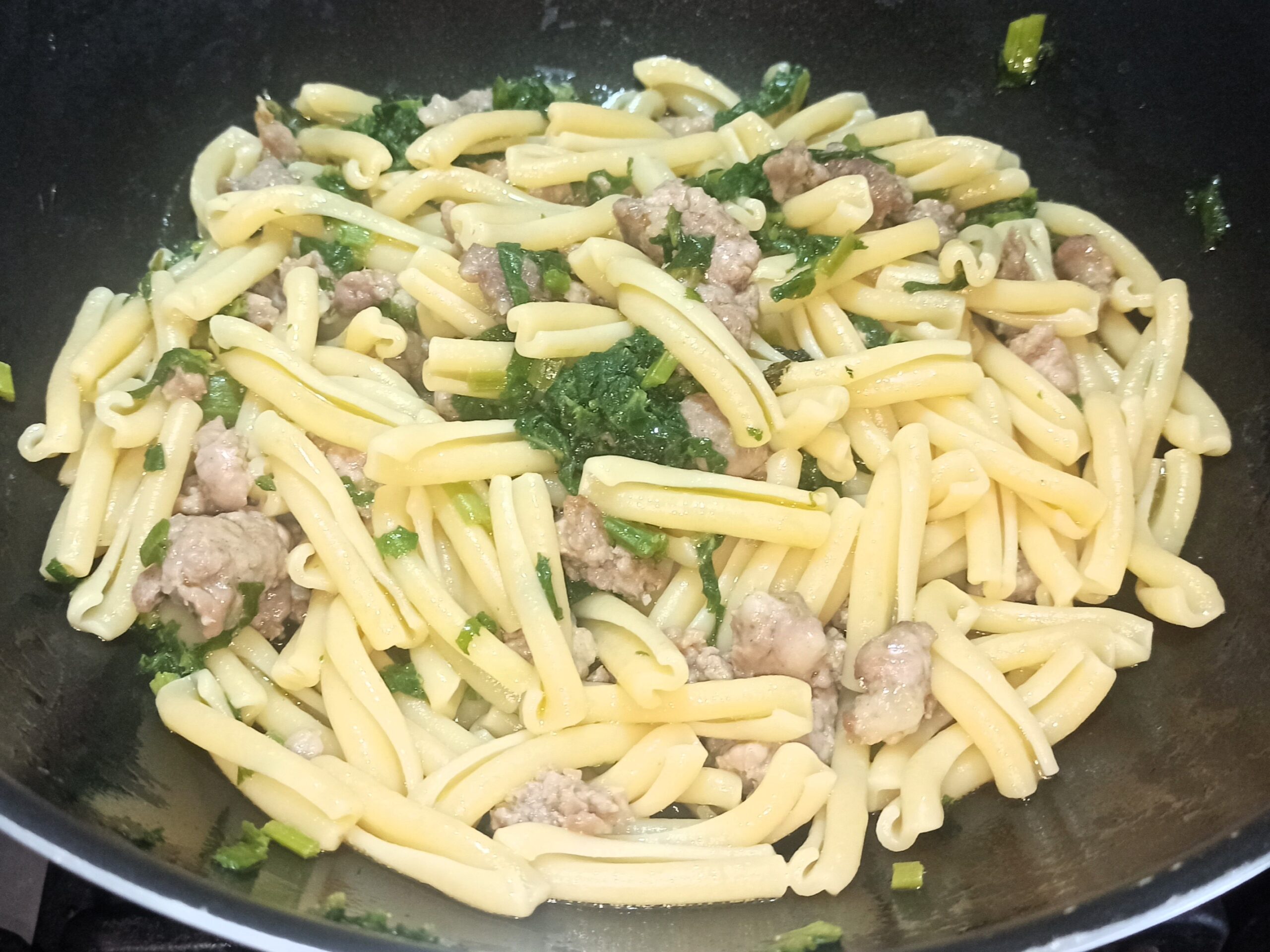 Appena la salsiccia sarà cotta, aggiungete i talli, e mescolate bene.