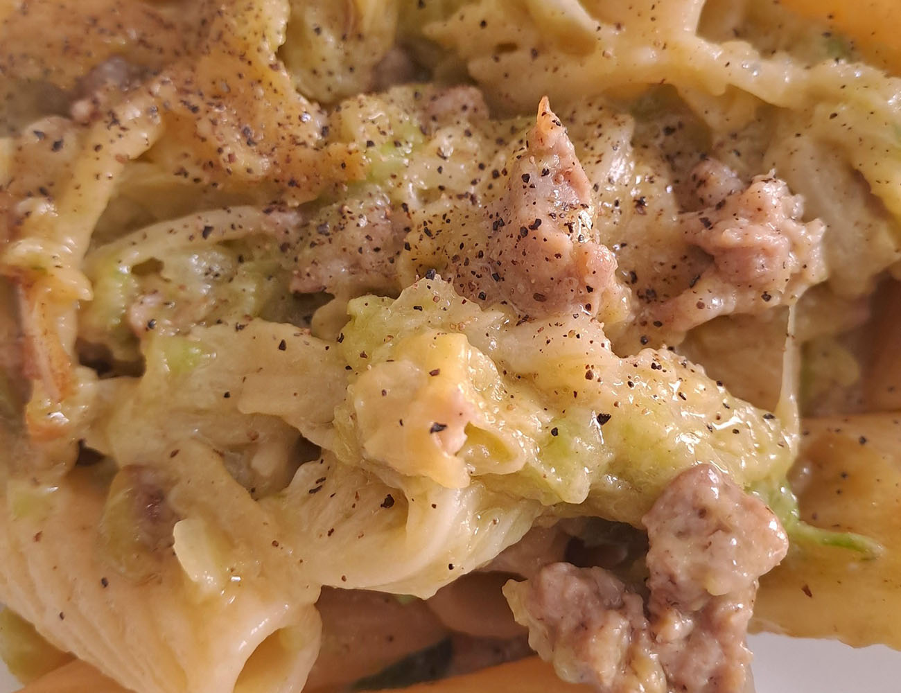 Tortiglioni con verza, salsiccia e crema di parmigiano e pepe