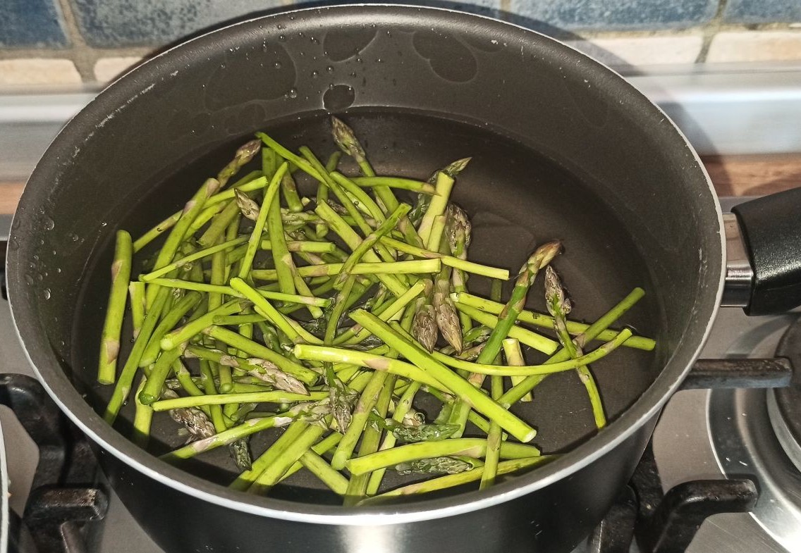Per preparare la pasta cremosa con salsiccia e asparagi, iniziate ad eliminare la parte legnosa degli asparagi. Lavateli, e sbollentateli per cinque minuti in acqua leggermente salata.