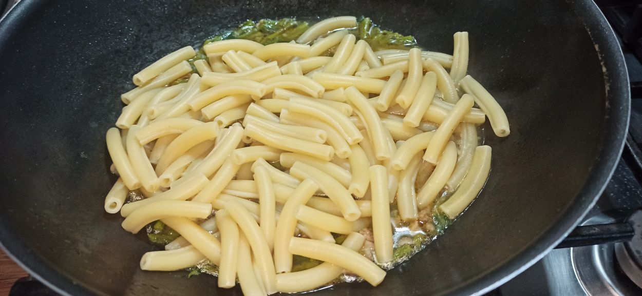 Sbriciolate la salsiccia, e fatela rosolare in una capiente padella, insieme alla cipollina tritata. Colate gli asparagi direttamente nella padella, conservate l’acqua di cottura per cuocere la pasta. Fate cuocere ed amalgamare per cinque minuti a fiamma bassa. Cuocete la pasta al dente, colatela nella padella, e spadellate a fiamma vivace.