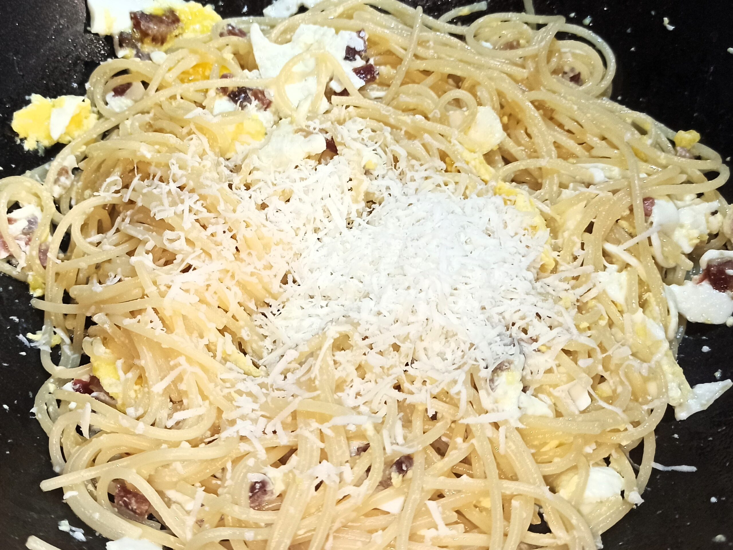 Appena la pasta sarà cotta, colatela direttamente nella padella, mescolate energicamente. Spegnente la fiamma, aggiungete il pecorino e mescolate ancora, se occorre aggiungete un poco d’acqua di cottura della pasta.