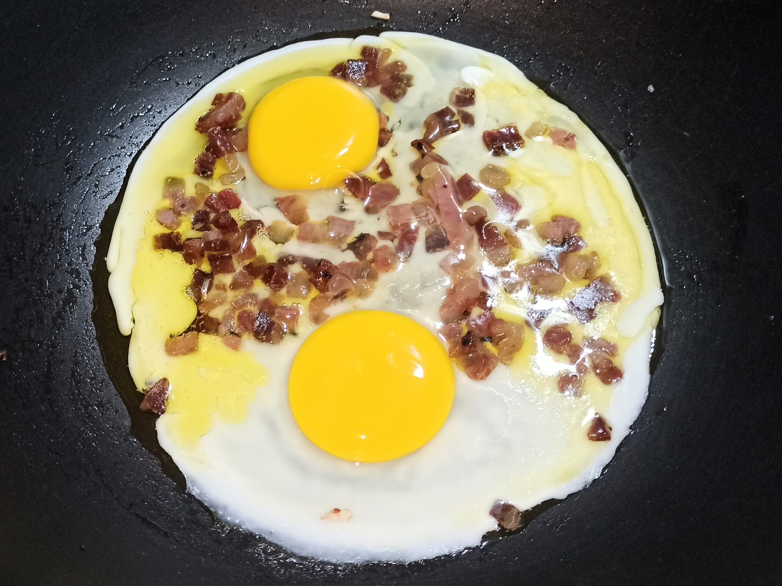 Appena il guanciale sarà rosolato e rilasciato il suo grasso, mettete la fiamma al minimo e aggiungete le uova, che dovranno rapprendersi leggermente.