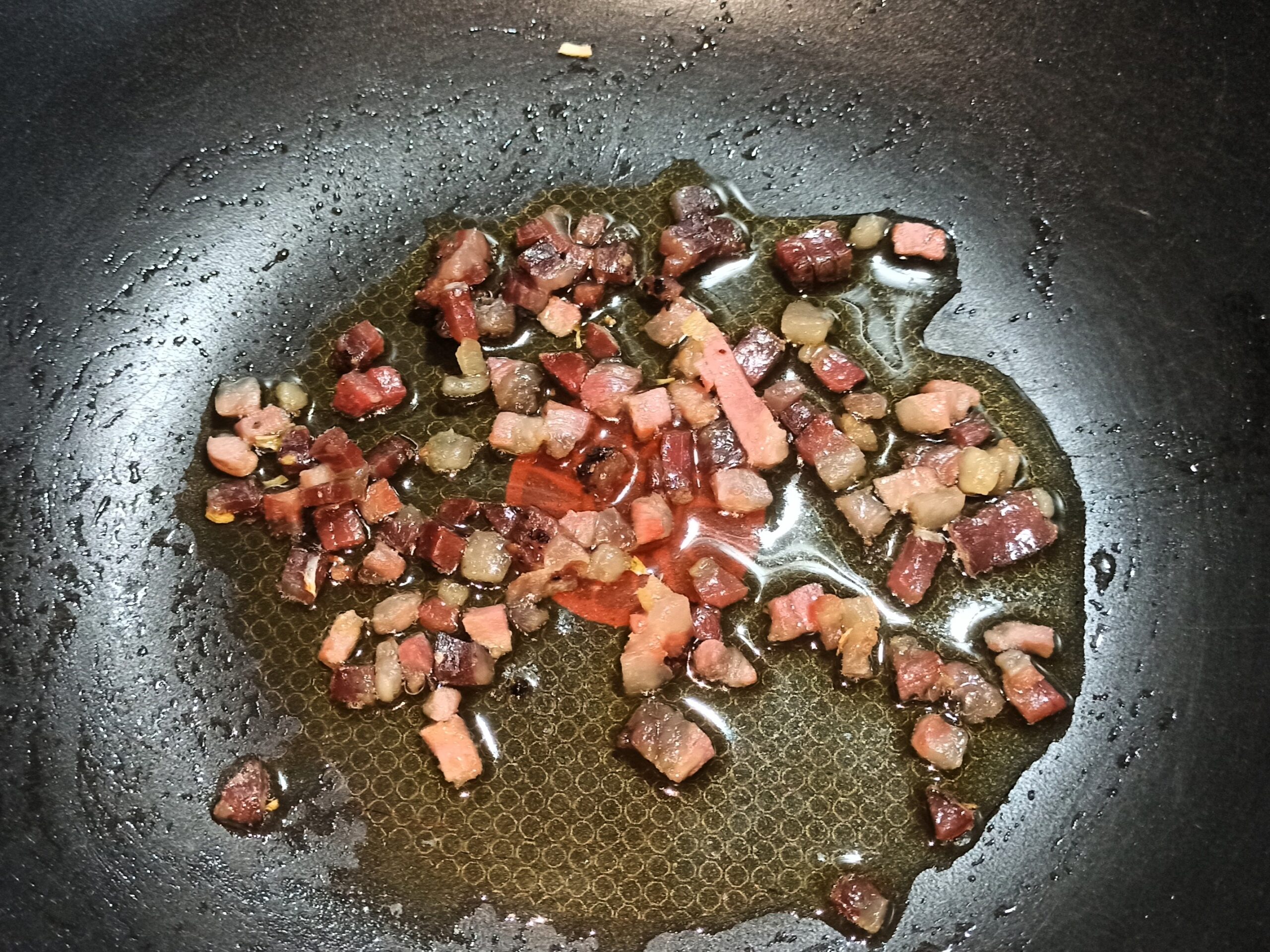 Mentre aspettate che l’acqua raggiunge il bollore, per iniziare la cottura della pasta, in una capiente padella, mettete la pancetta e/o il guanciale, tagliato a pezzetti, e senza aggiungere ulteriori grassi, iniziate a farlo rosolare a fiamma media.