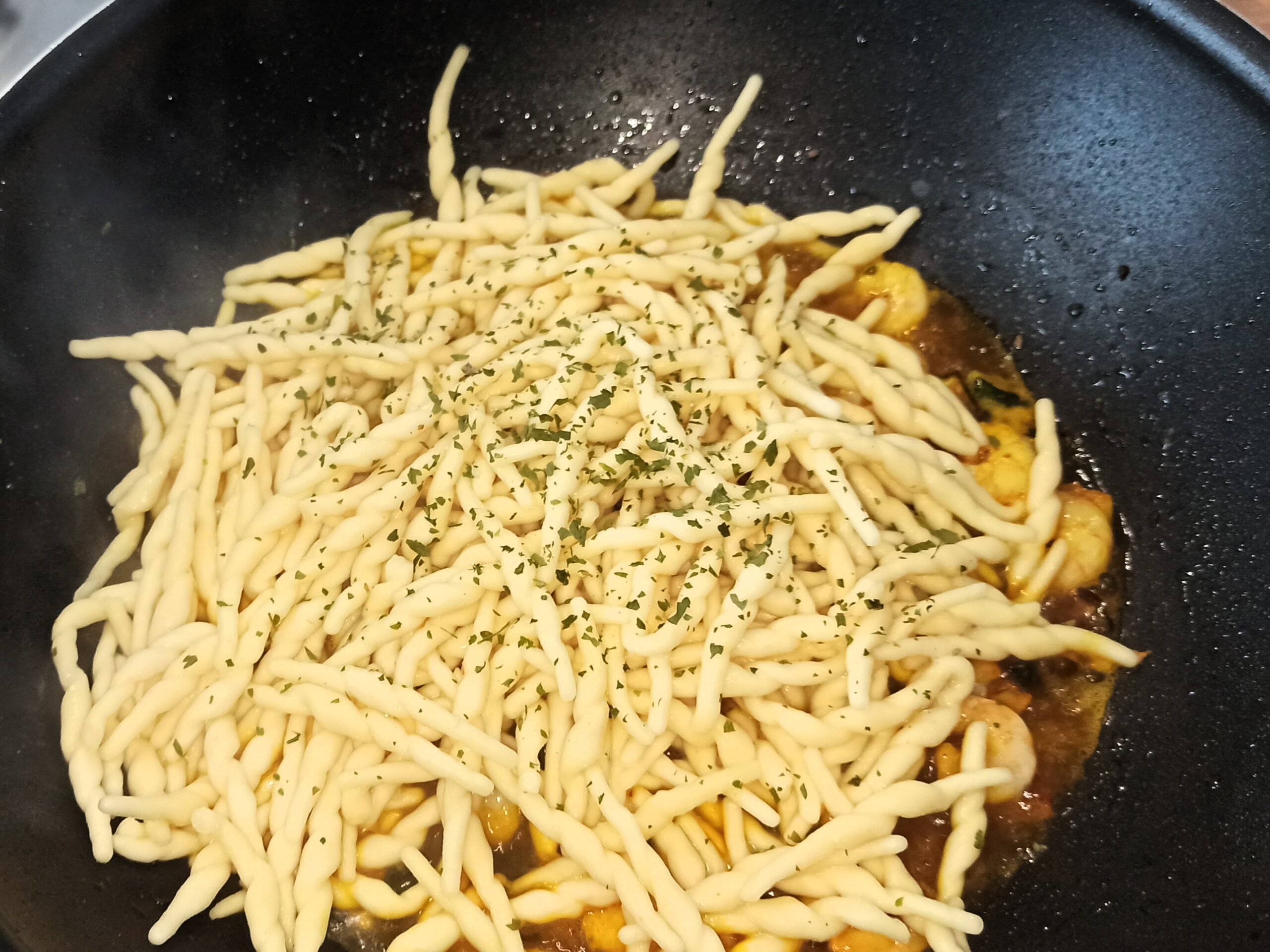 Cuocete le trofie, se occorre aggiungete un poco d’acqua al brodetto. Colatele al dente direttamente nella padella, spadellate,