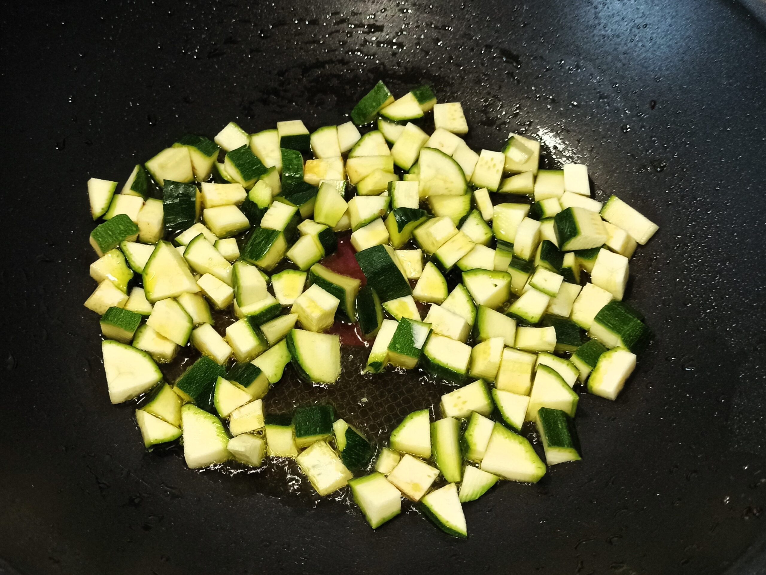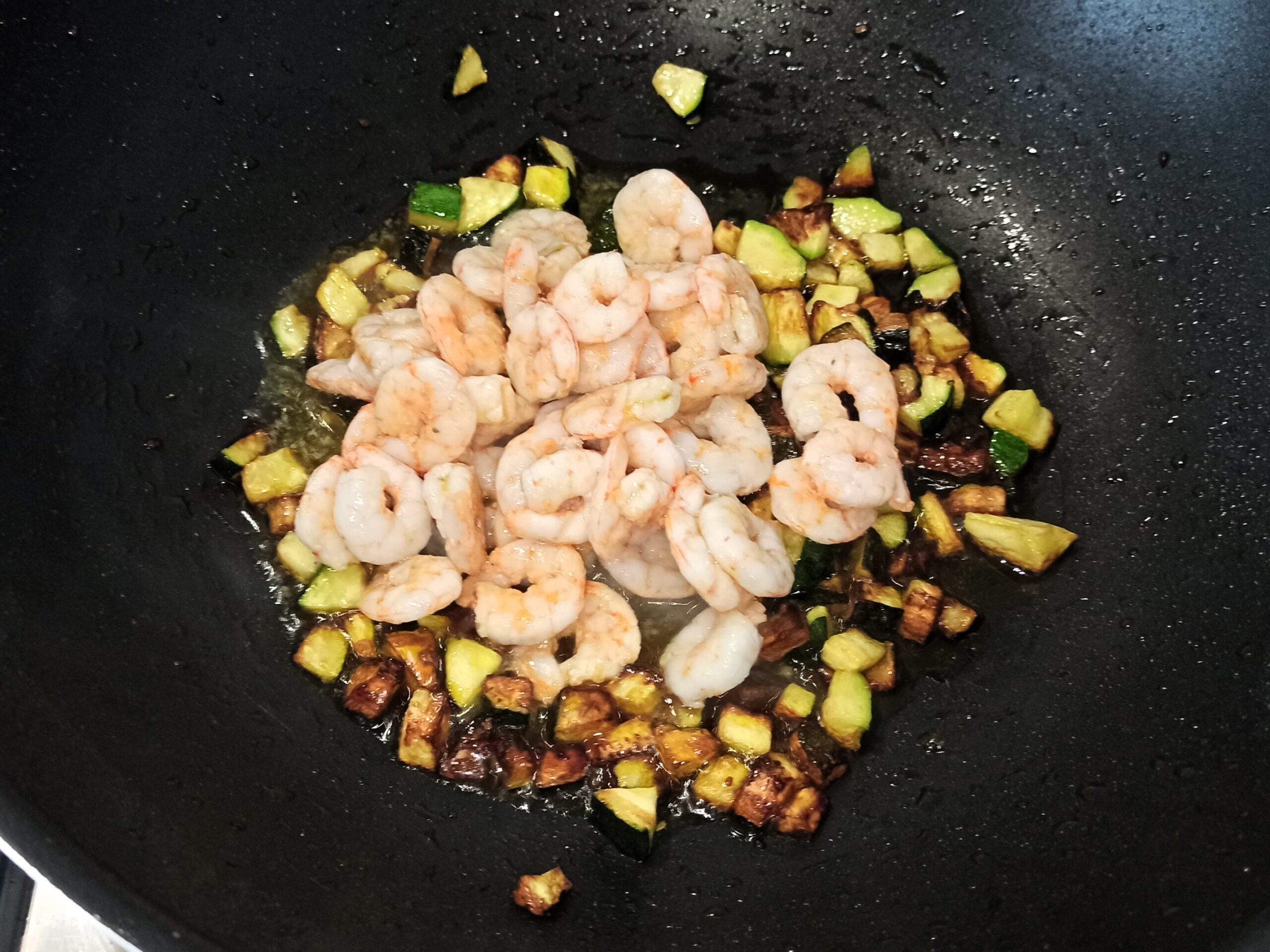 Lavate la zucchina, eliminate le due estremità, e tagliatela a dadini, cuoceteli nella stessa padella dove avete cotto i gamberetti, aggiungendo anche lo spicchio d’aglio.