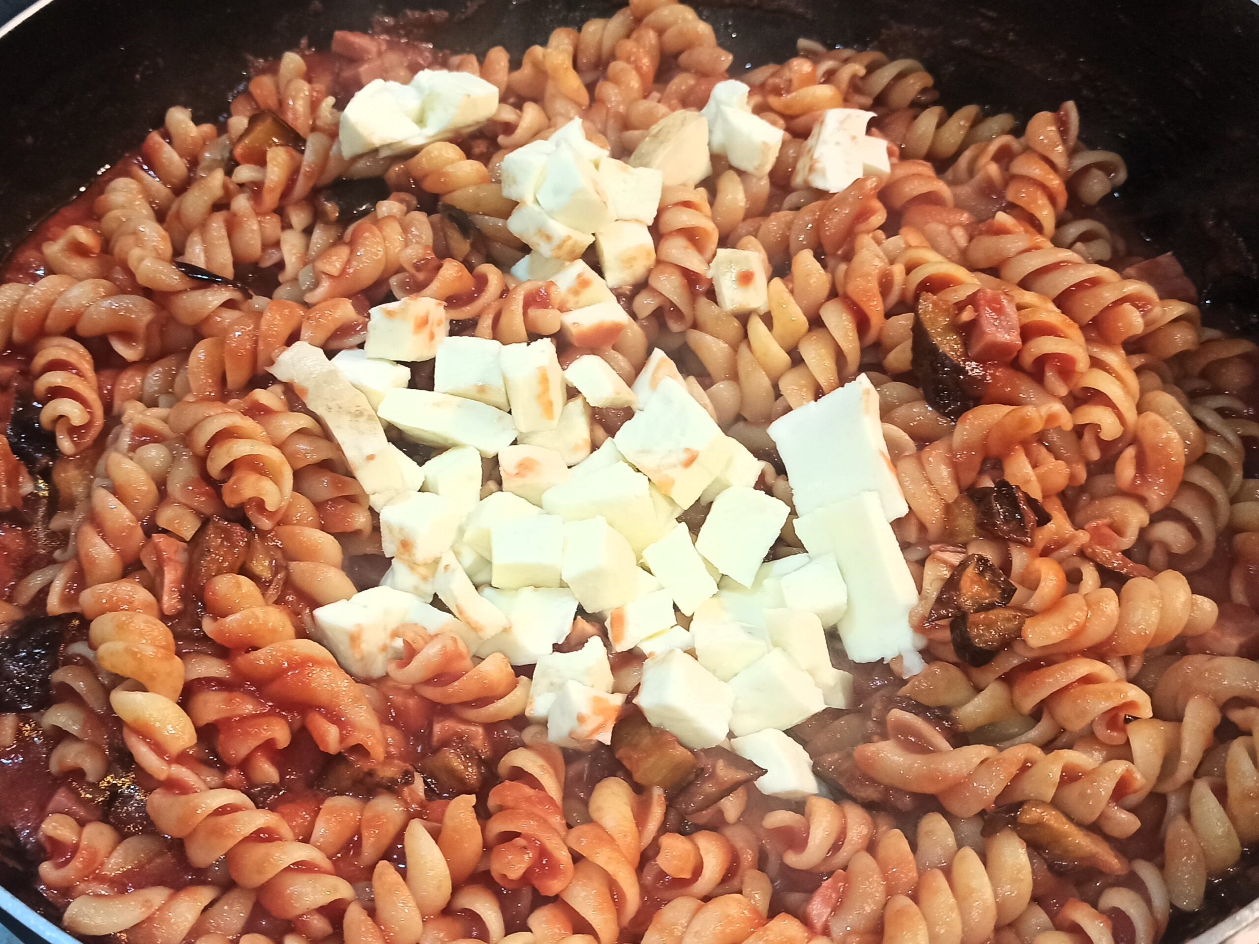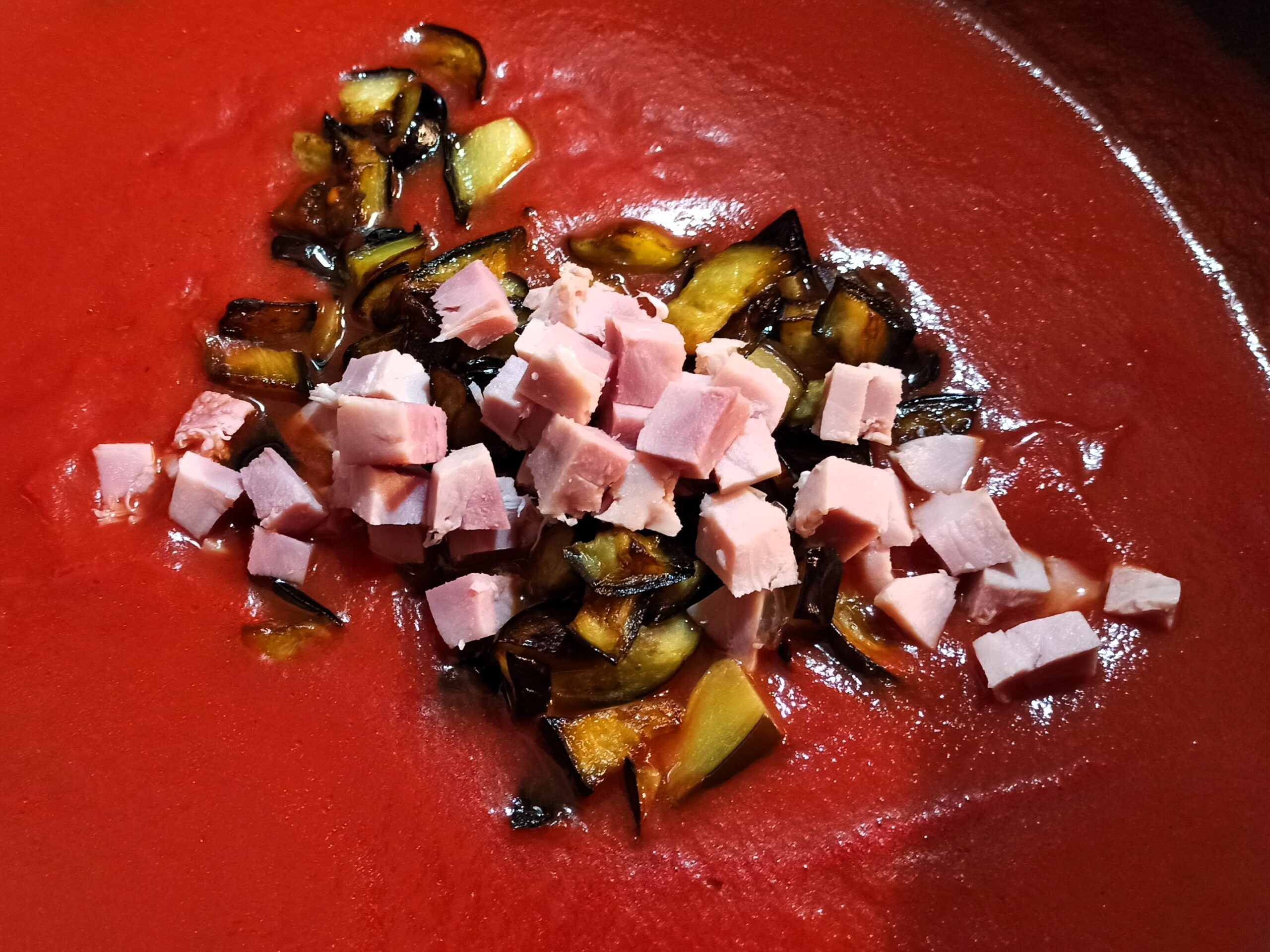 Appena saranno cotte, mettetele in una ciotolina. Aggiungete il passato di pomodori, e fate cuocere per circa dieci minuti. Aggiungete le melanzane, il prosciutto cotto, e fate cuocere per altri dieci minuti,