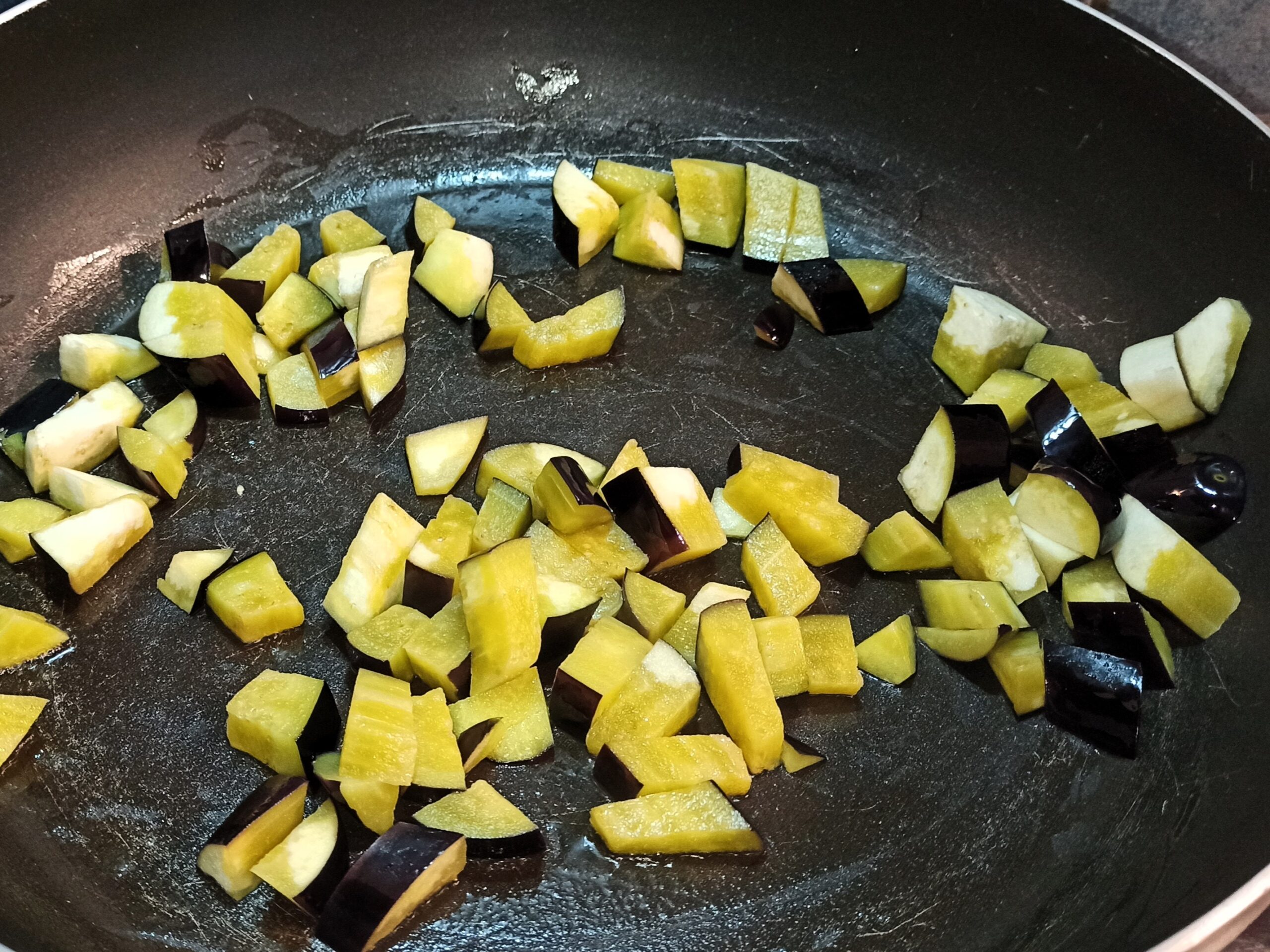 Lavate le melanzane, eliminate le due estremità, e tagliatele a dadini. Mettete le melanzane nella padella e fatele rosolare in maniera uniforme.