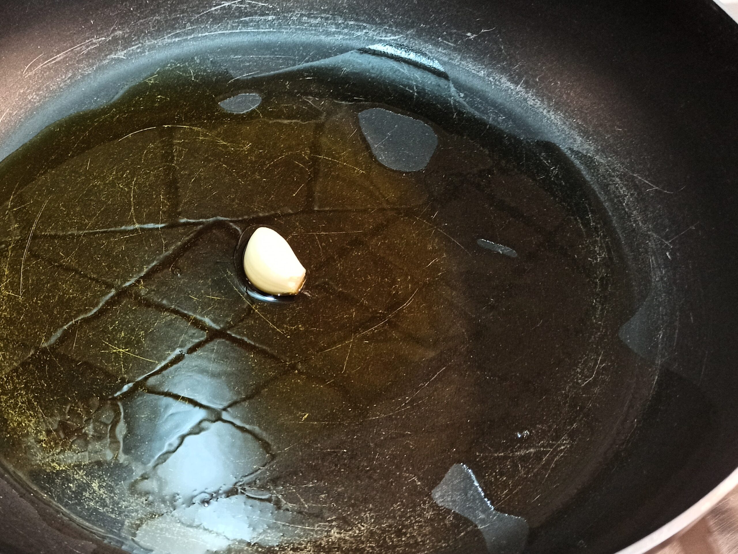 Mettete un paio di giri abbondanti di olio evo, in una capiente padella, fate imbiondire ed eliminate lo spicchio d’aglio.