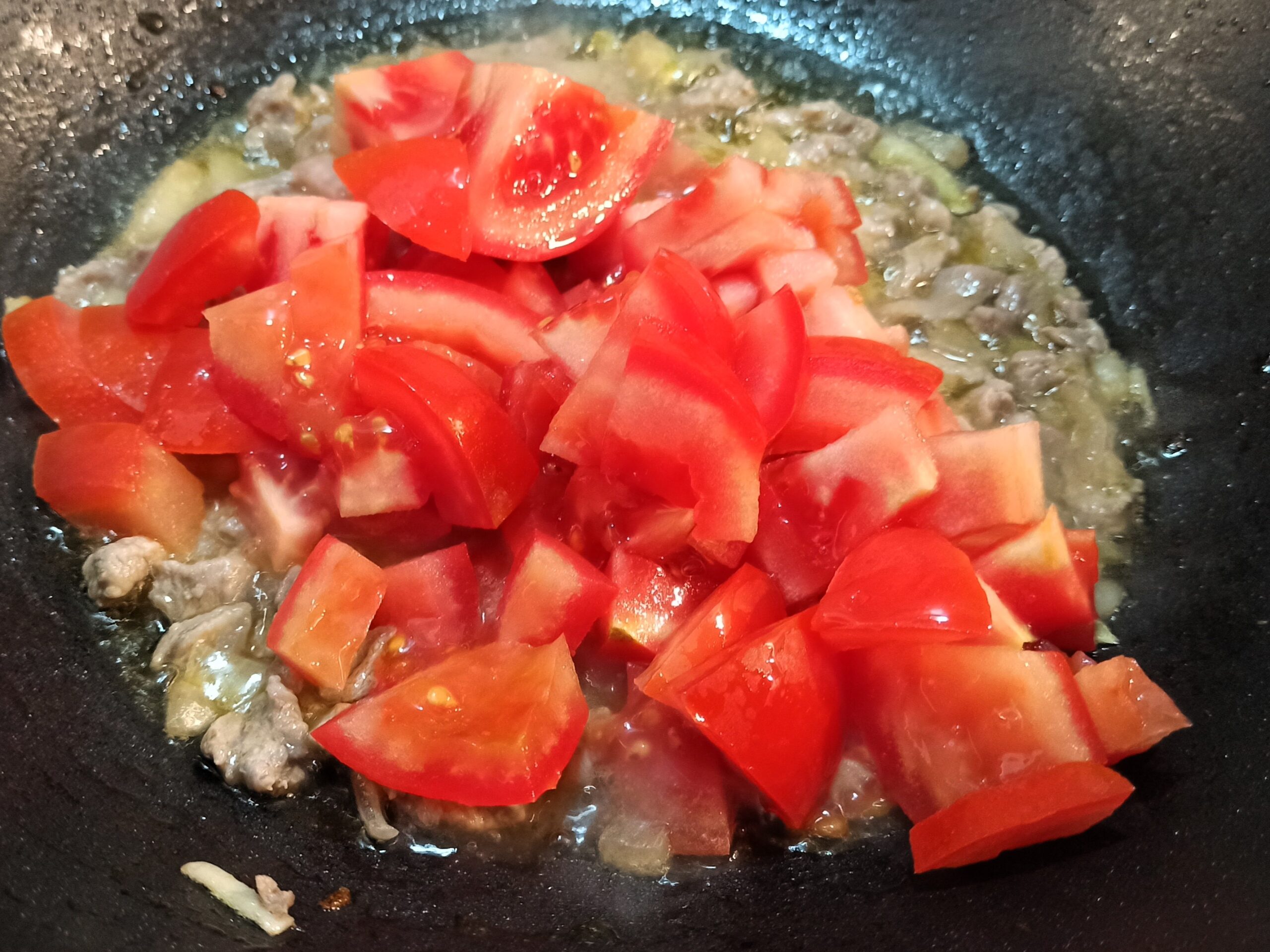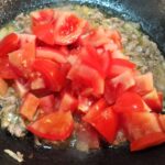 Fate rosolare a fiamma media, mescolando spesso, poi aggiungete il whisky, lasciate sfumare, e aggiungete i pomodorini tagliati a pezzetti.