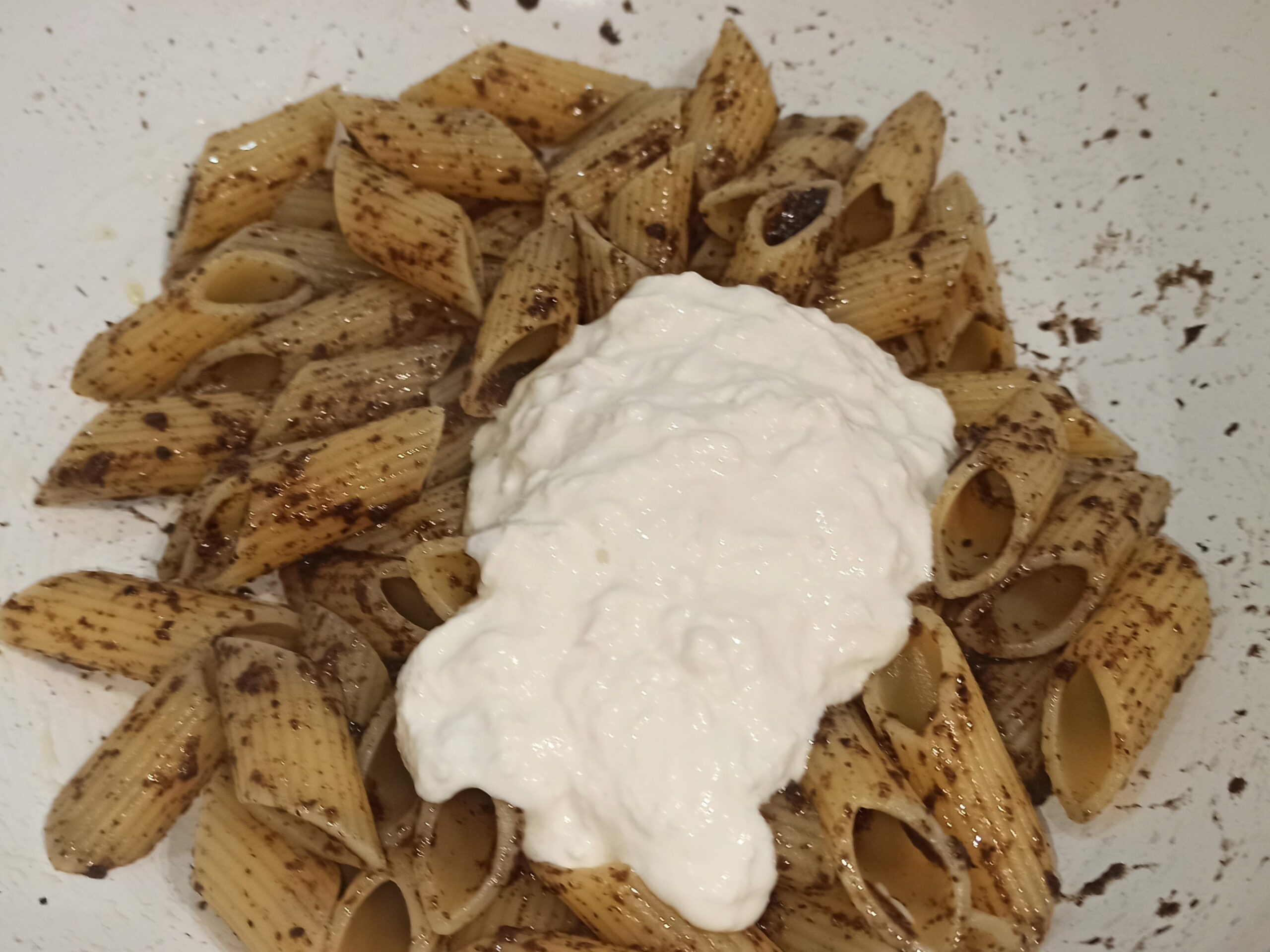Aggiungete un poco d’acqua di cottura, e amalgamatela al pesto di tartufo, a fiamma media. Spegnete la fiamma, aggiungete la parte interna della burrata,