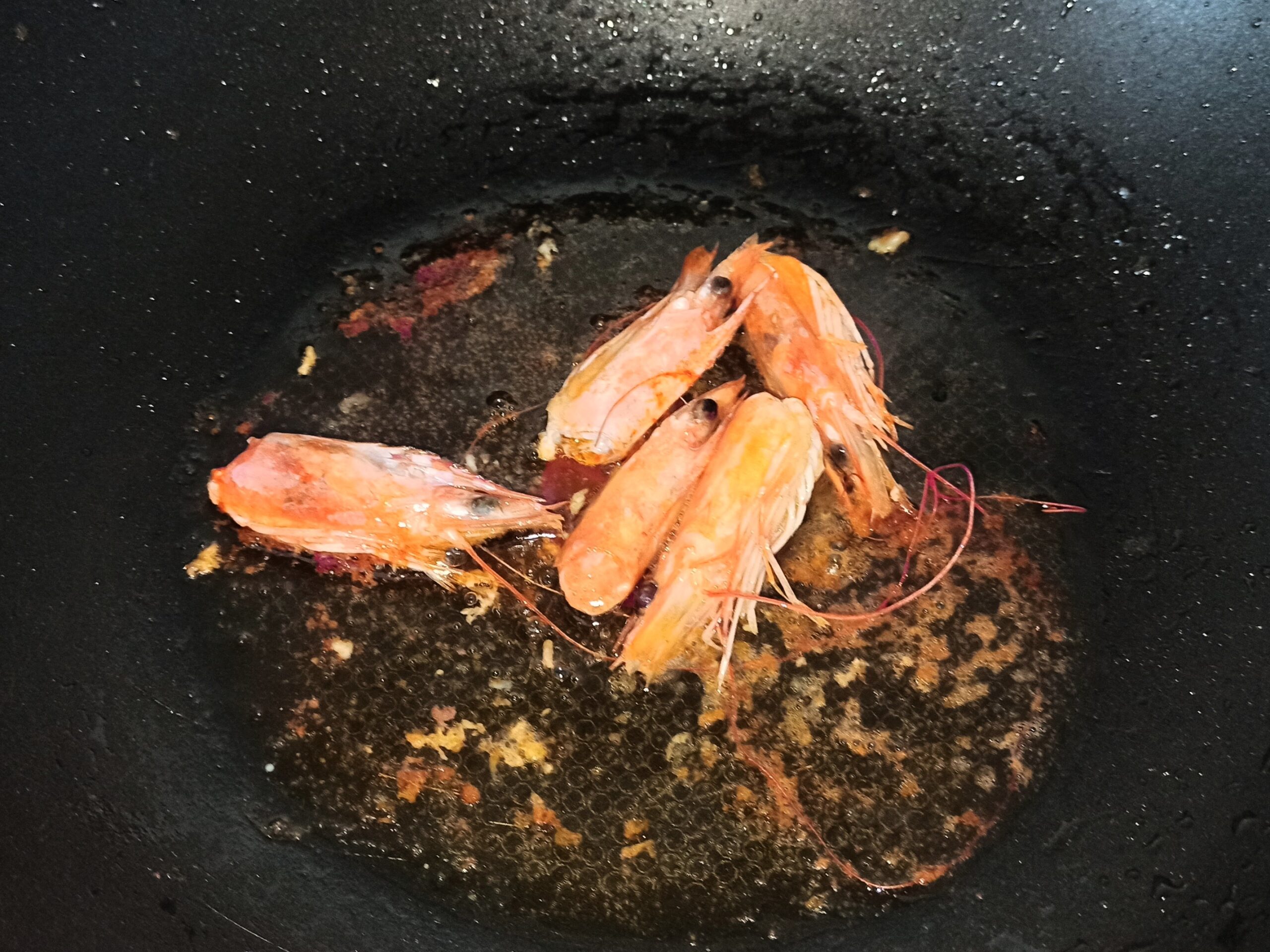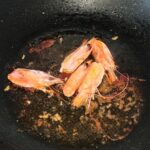 aggiungete le teste dei gamberi, e fatele rosolare, schiacciatele, sfumate con il brandy, ed eliminatele.