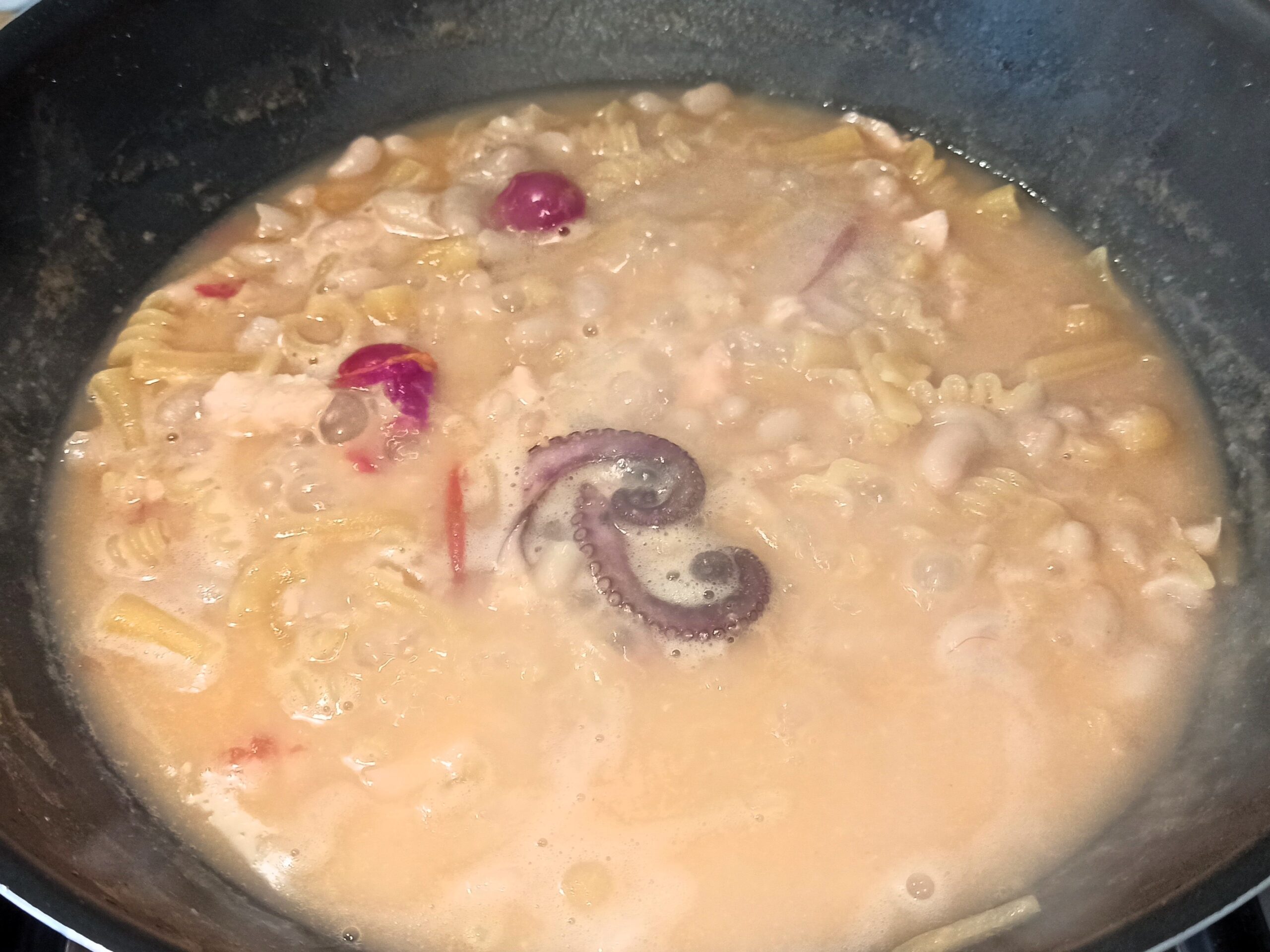A metà cottura, aggiungete i calamari ed i polpi,