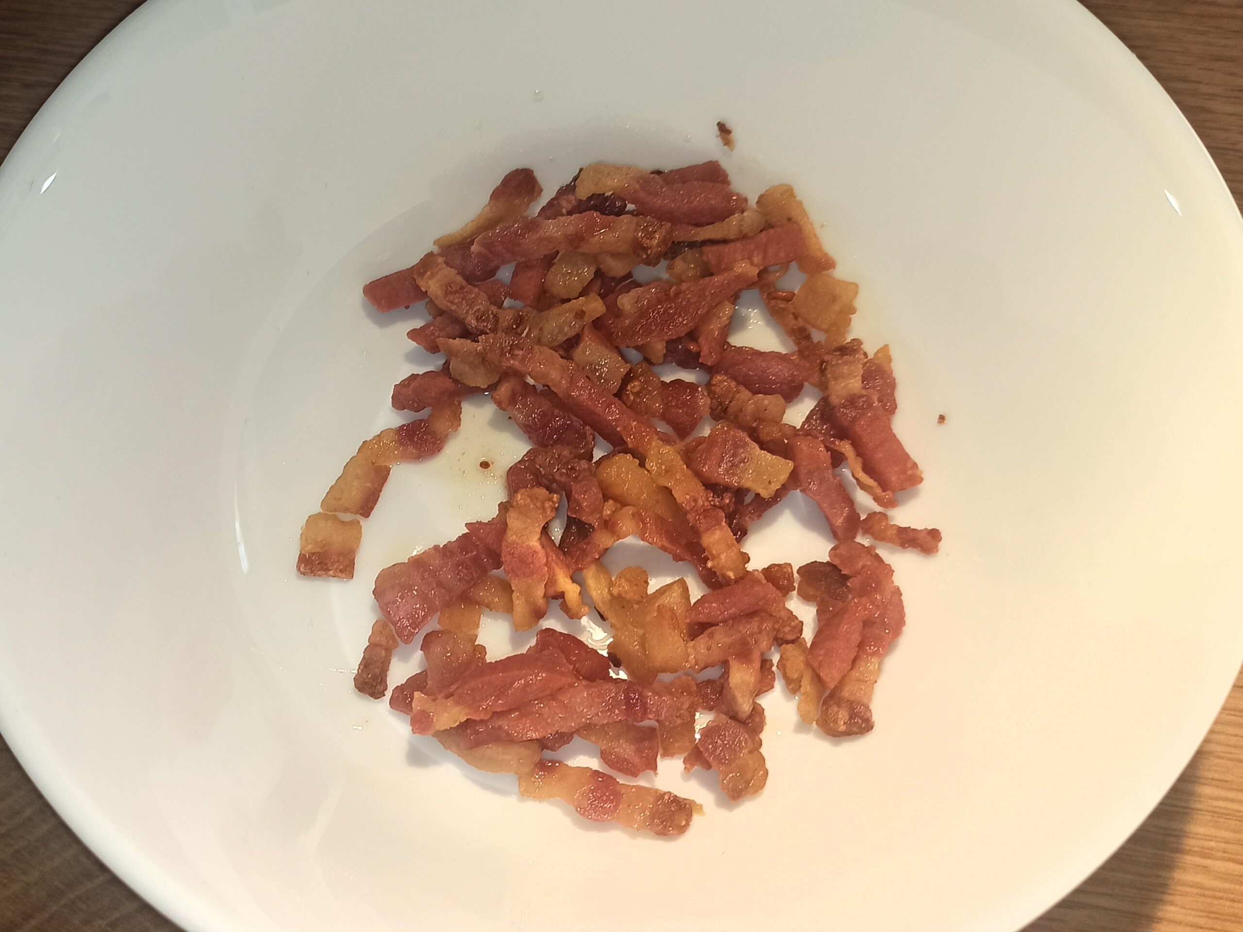 Iniziate a tagliare il guanciale a striscioline, fatelo rosolare in una padella antiaderente, senza aggiungere ulteriori grassi, trasferitelo in una ciotolina, senza il grasso rilasciato.