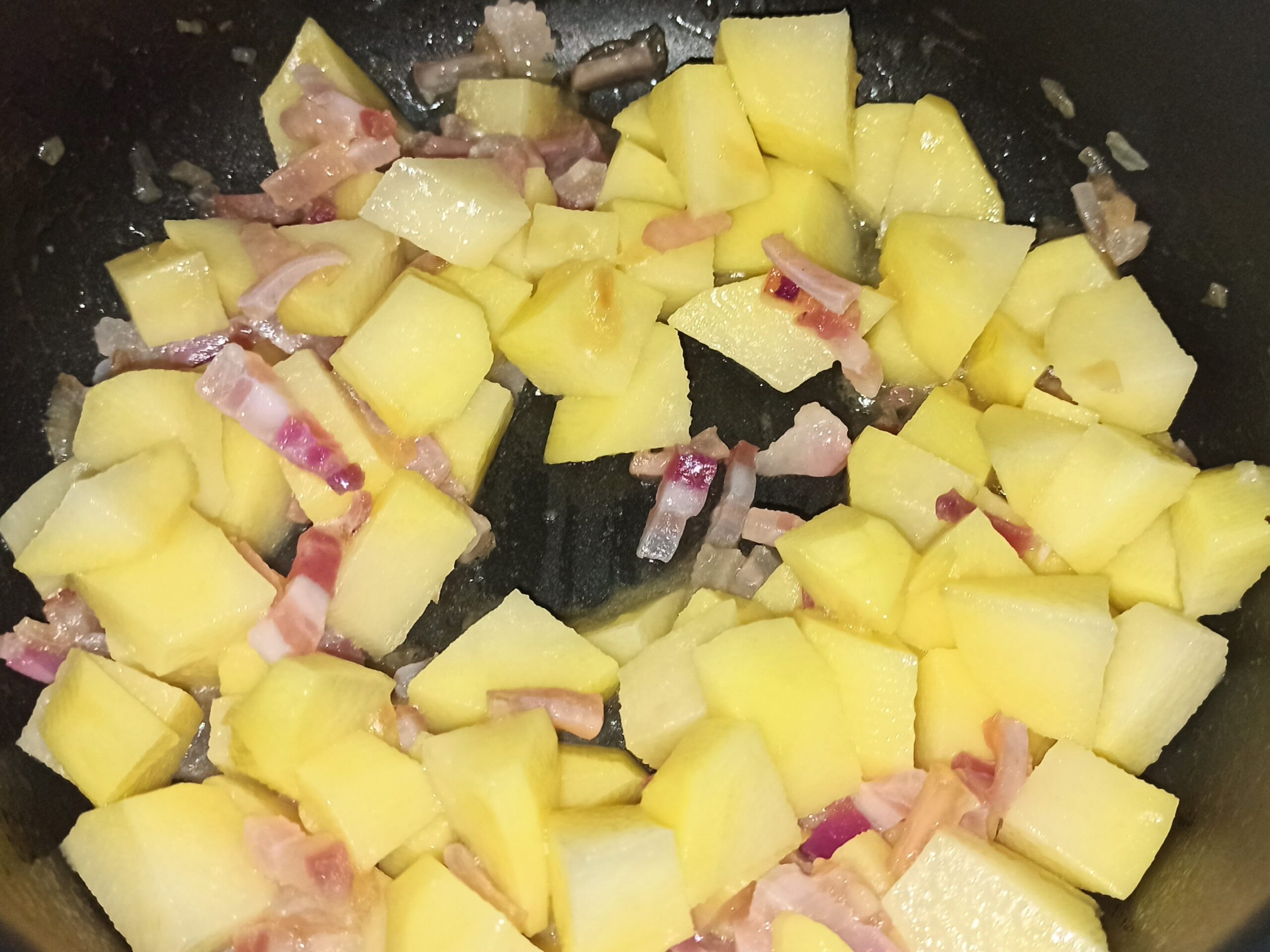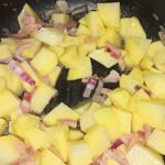 Sbucciate e tagliate a fettine sottilissime la cipolla. In una capiente pentola, mettete un paio di giri abbondanti di olio evo, poi unite la cipolla e la pancetta, fate soffriggere per un minuto. Pelate, lavate e tagliate a tocchetti le patate,
