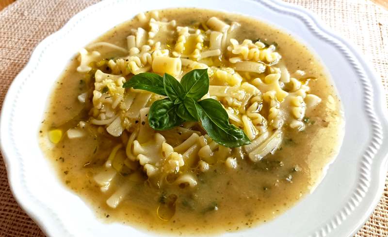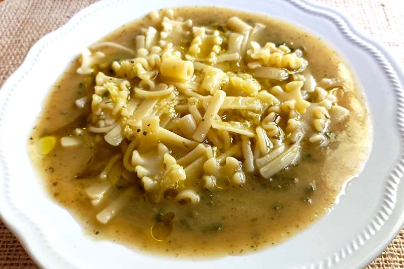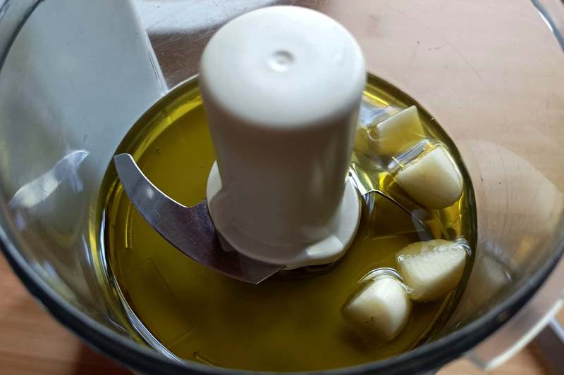 Frullate l’aglio con l’olio.Fate bollire l’acqua di cottura delle verdure, ed insaporitela con un cucchiaio di olio all’aglio ed una presa di sale e poco pepe,