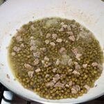 In una capiente padella, mettete un paio di giri d’olio evo, aggiungete la cipolla e la puntina, e fate rosolare a fiamma media per un paio di minuti. Sfumate con i martini, fate evaporare l’alcol e aggiungete i piselli, fate rosolare ancora per due minuti, poi aggiungete un bicchiere d’acqua, e continuate la cottura a fiamma bassa.
