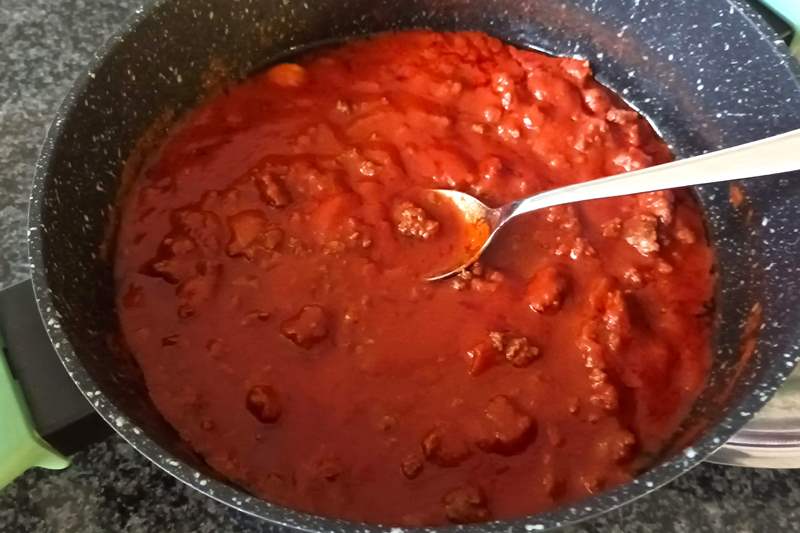 Una volta che il vino sarà evaporato, versate nel tegame la passata di pomodoro, due cucchiai di acqua, aggiustate di sale, spolverizzate con una macinata di pepe, aggiungete l’alloro e lasciate cuocere il ragù a fuoco basso per circa mezz’ora, mescolando di tanto in tanto per evitare che si attacchi.