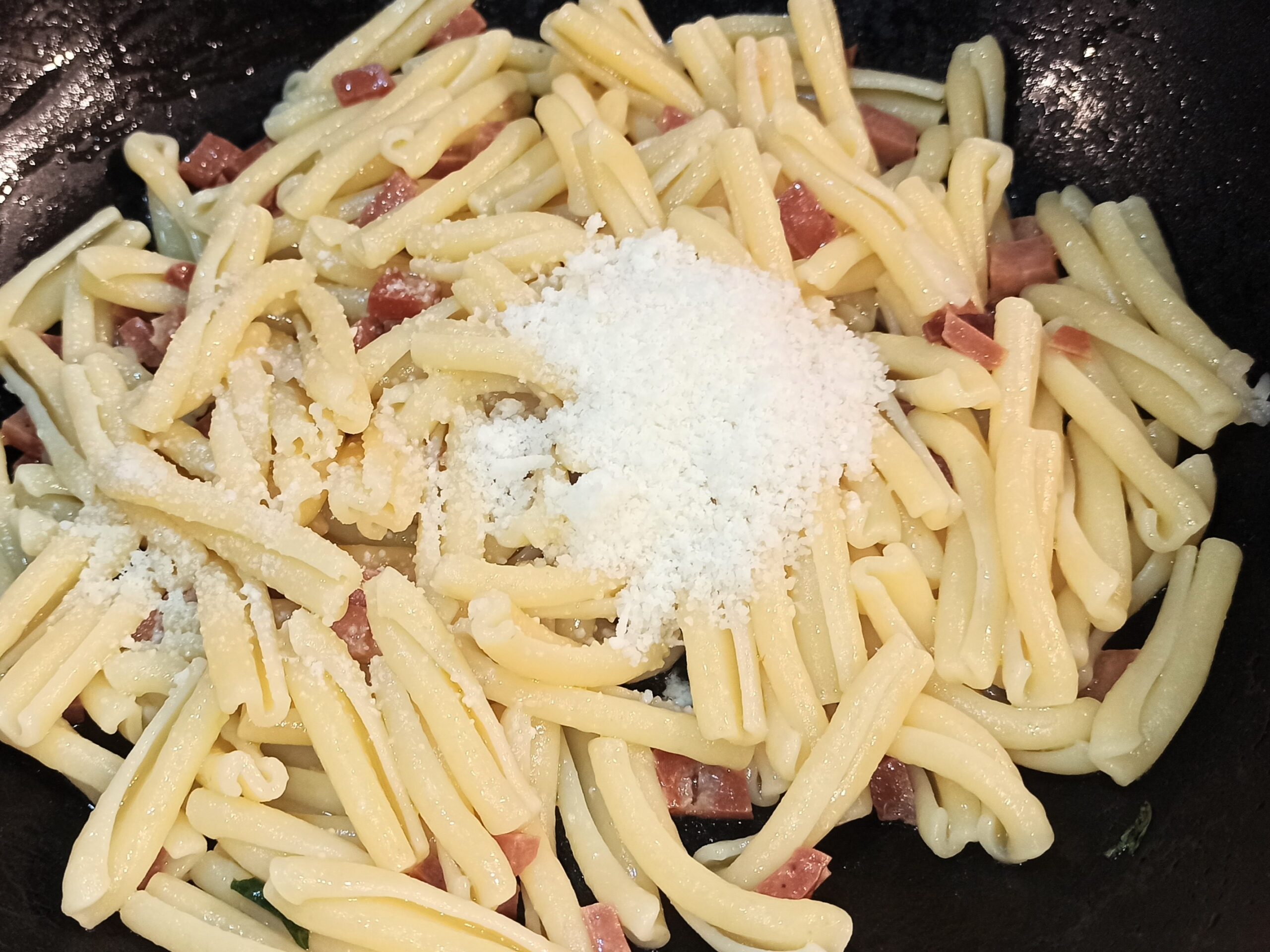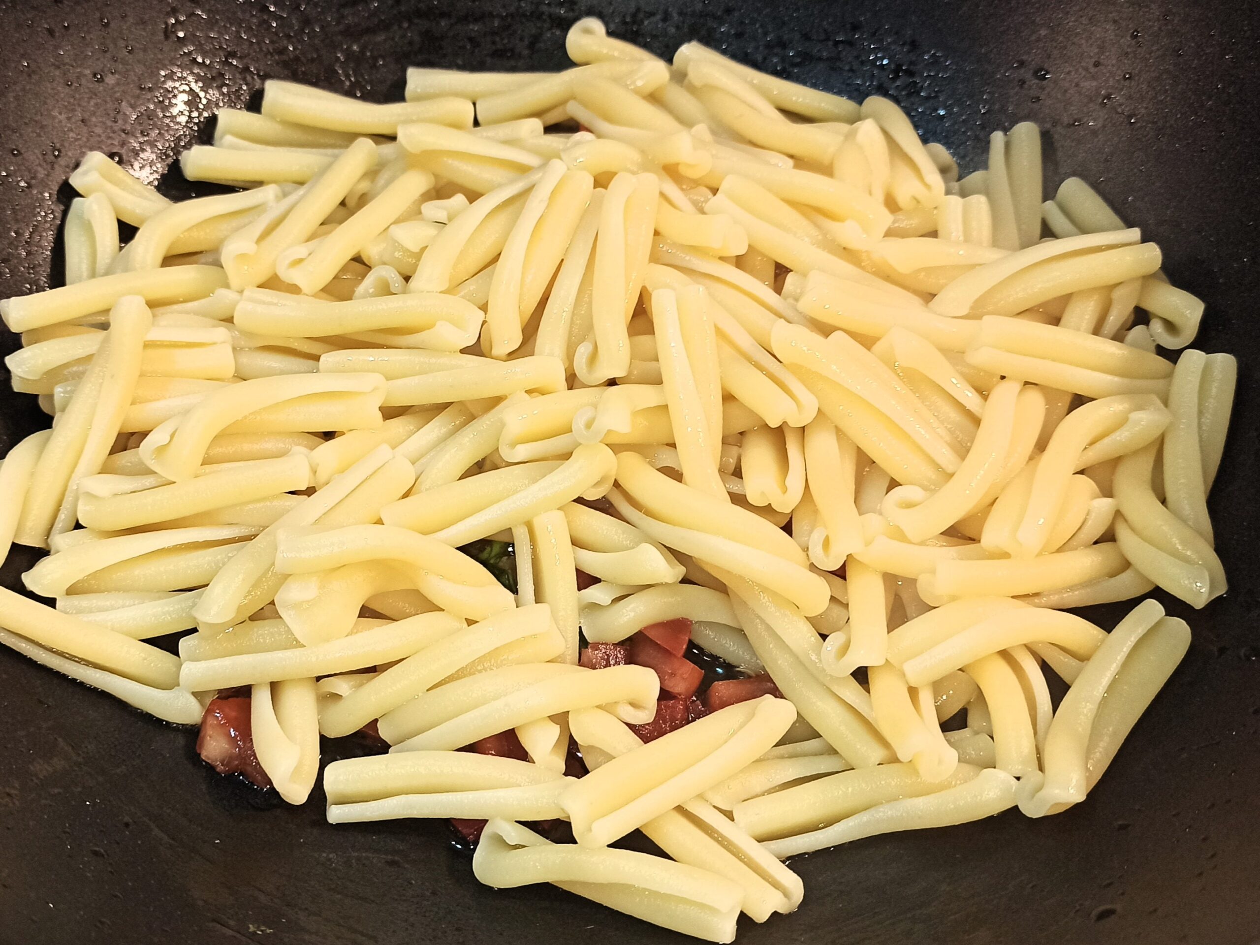 Cuocete al dente le casarecce, in abbondante acqua salata, e colatele direttamente nella padella, dove ormai l’alcol del vino sarà sfumato.