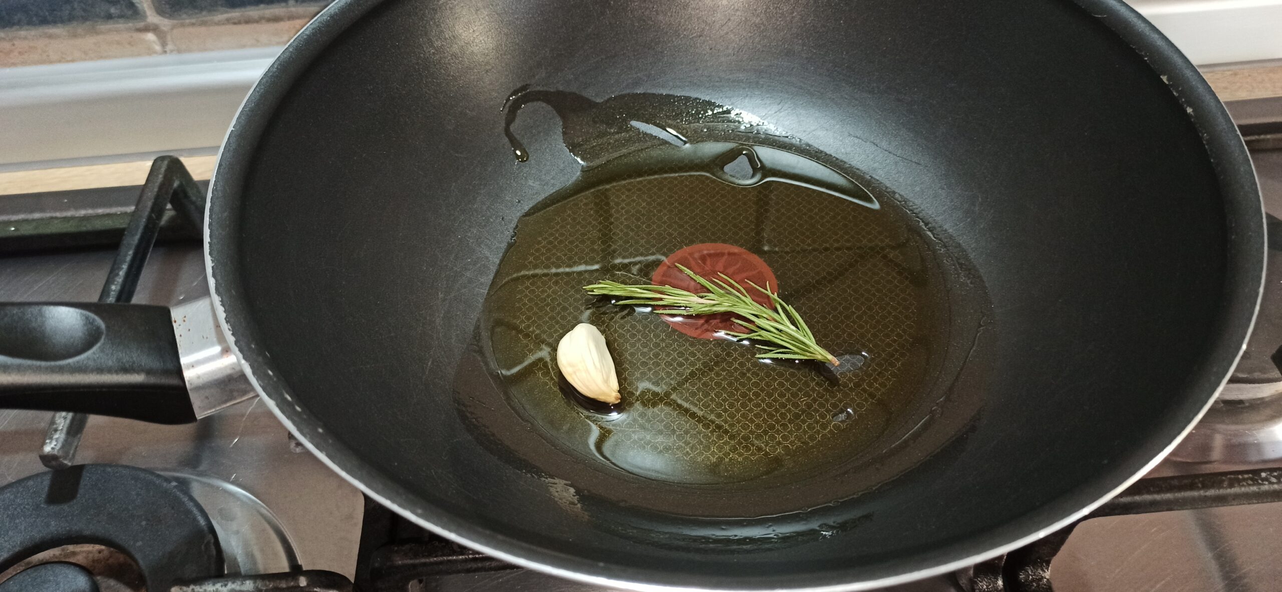 Per preparare le casarecce con mortadella e burrata, iniziate a mettere un paio di giri d’olio evo in una capiente padella. Aggiungete lo spicchio d’aglio ed il rametto di rosmarino, fate sfrigolare a fiamma media, fino a quando l’aglio non sarà imbiondito.
