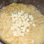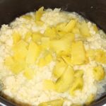 Scaldate anche le patate, sbucciatele e tagliatele a pezzetti. In un capiente pentolino, mettete un giro d’olio evo, lo spicchio d’aglio. Fatelo sfrigolare per un paio di minuti, eliminatelo, aggiungete il cavolfiore, con un mestolo d’acqua di cottura, poi aggiungete anche le patate.