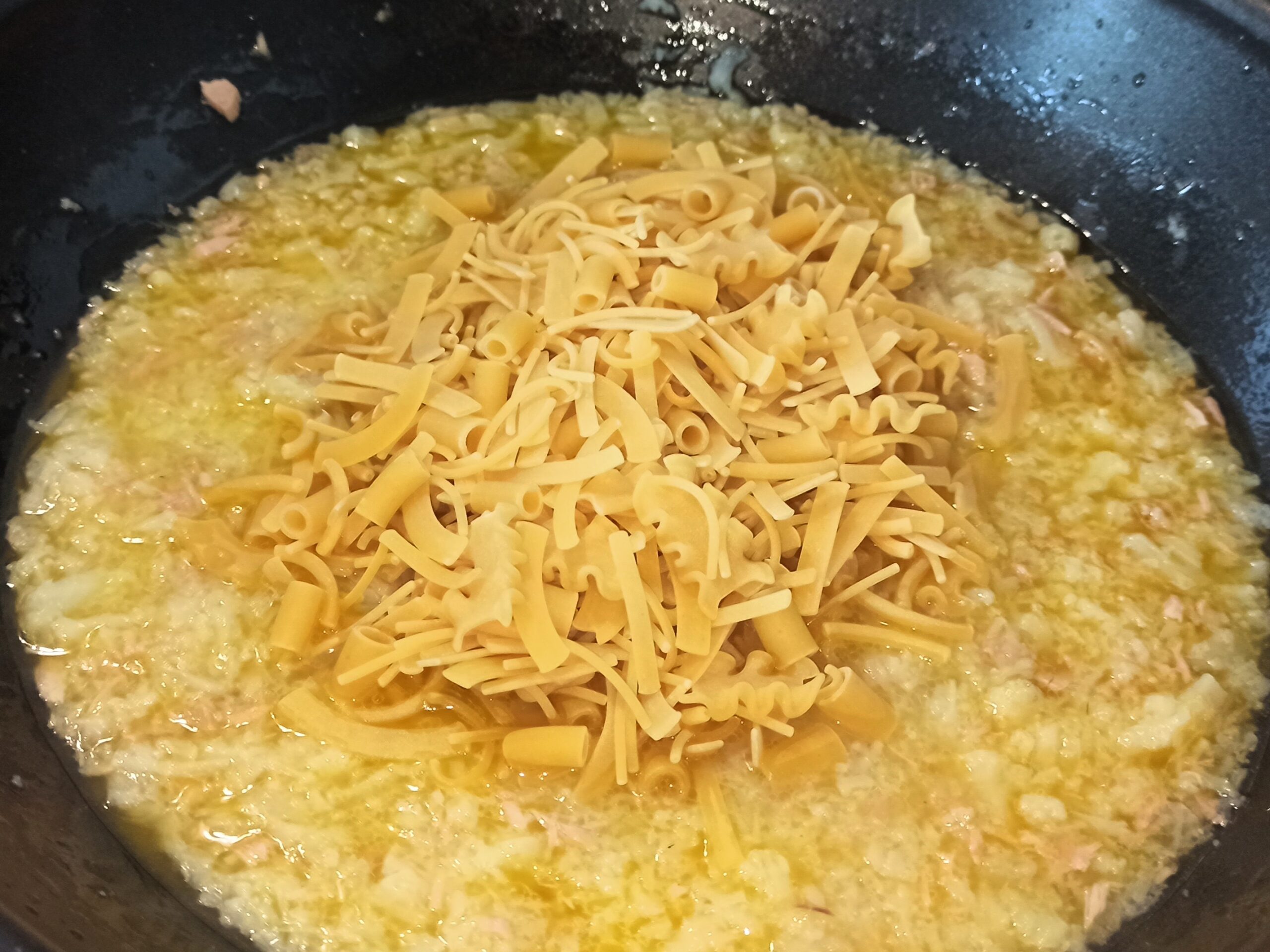 Fate soffriggere per un paio di minuti, poi aggiungete il cavolo, mescolate. Fate insaporire per qualche minuto, poi aggiungete un poco d’acqua di cottura, portate ad ebollizione, aggiungete la pasta.