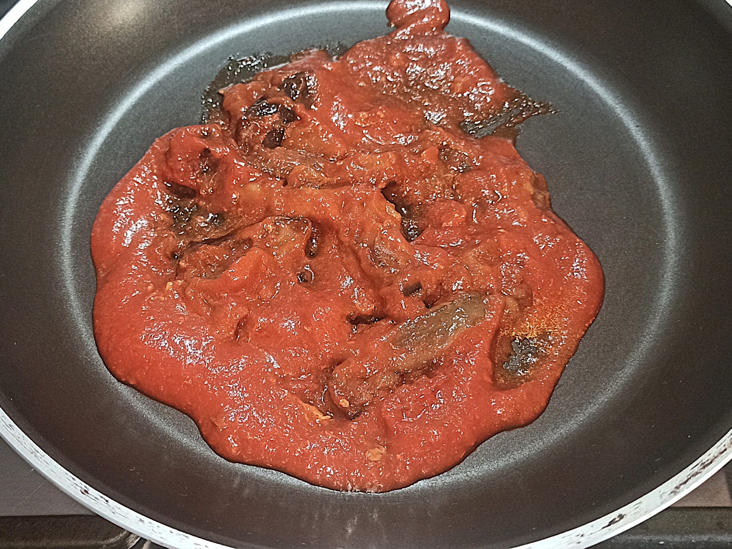 Per preparare la pasta pasticciata, iniziate a mettere in una capiente padella, le melanzane ed il sugo al pomodoro, regolate di sale e mescolate.