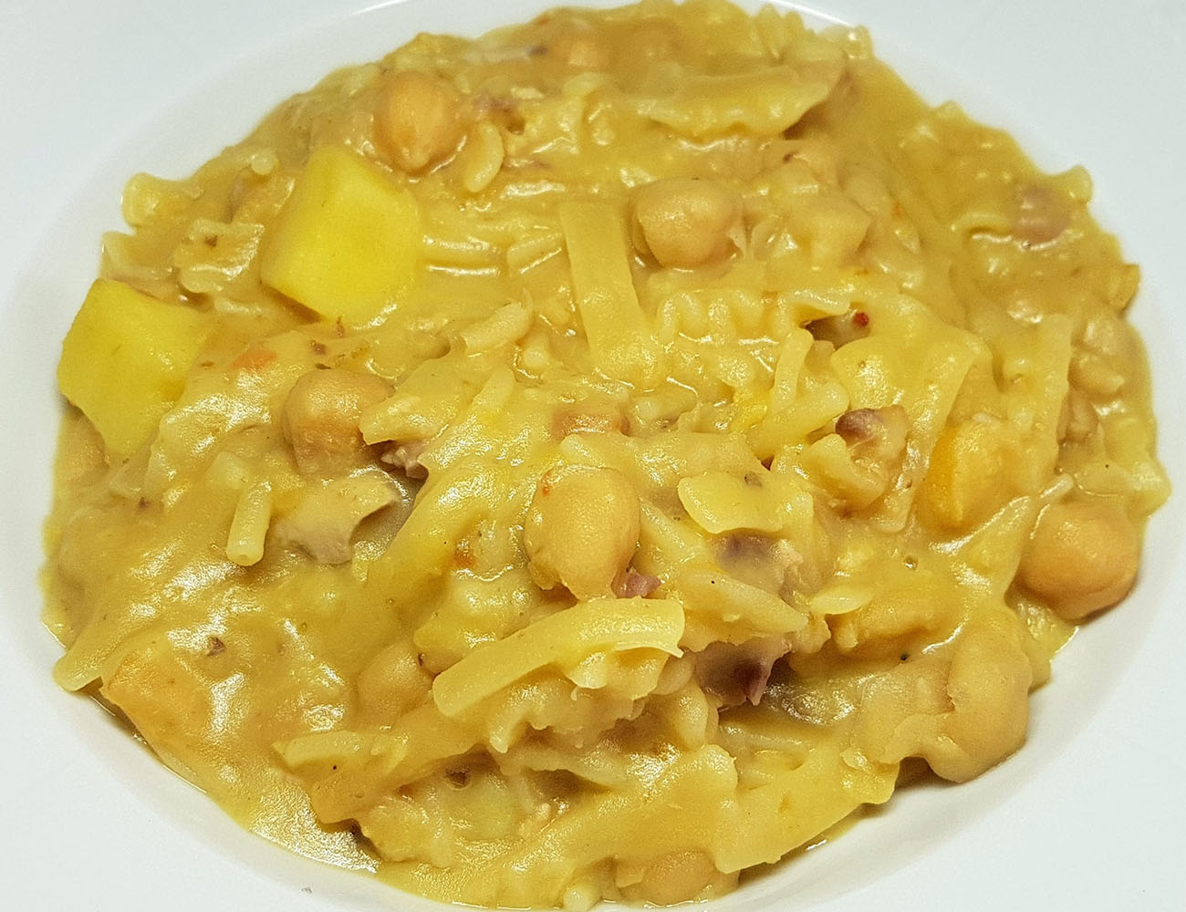 Cuocete la pasta nell’acqua dei ceci, aggiungendo di tanto in tanto un mestolo di acqua bollente. Una volta che la minestra di pasta, ceci e patate è pronta, spegnete il fuoco, aggiustate di sale, aggiungete pepe nero macinato, un filo d’olio e mescolate. Lasciate riposare per tre o quattro minuti prima di servire. Buon appetito!