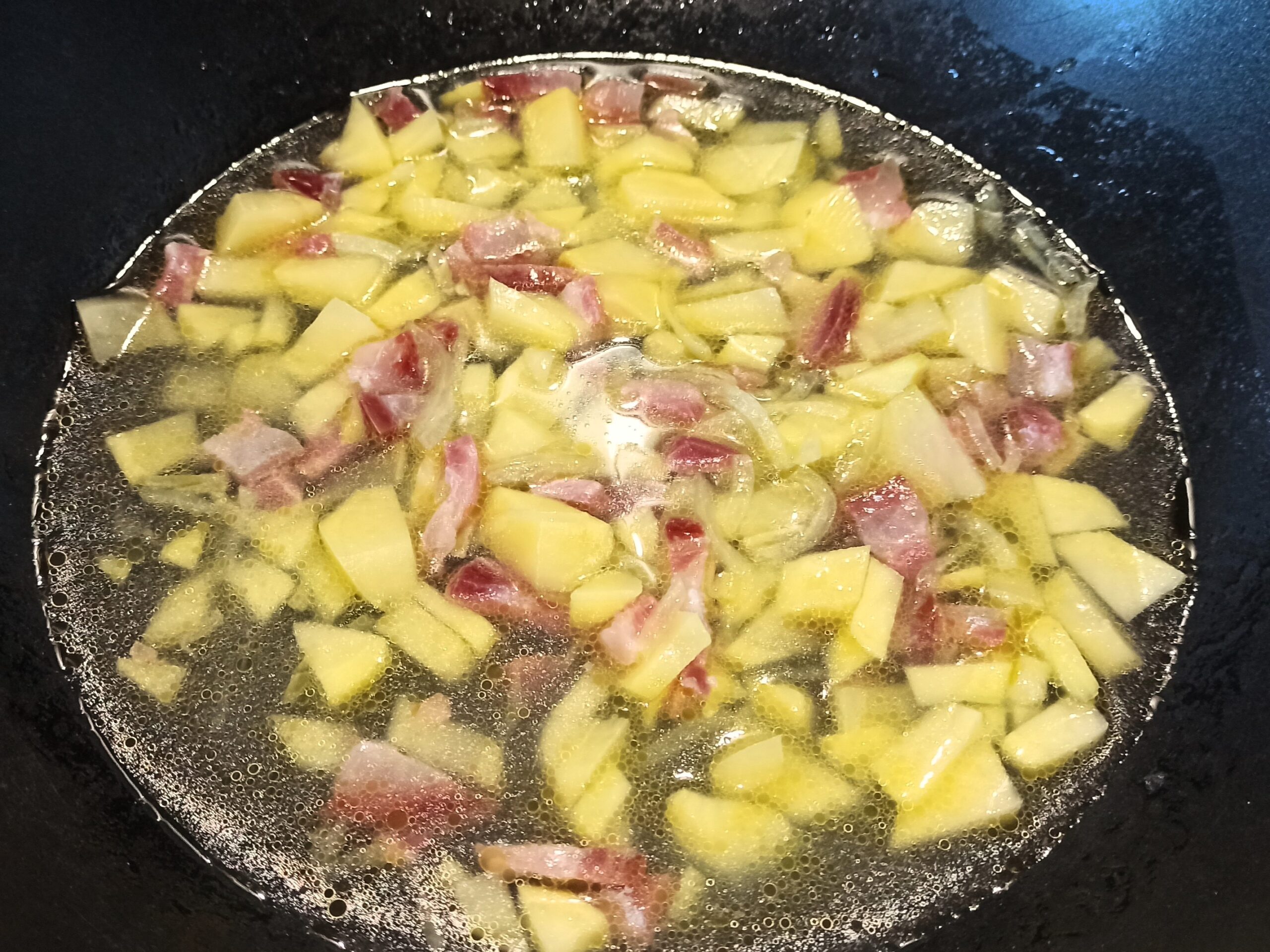 Aggiungete le patate, fate sfrigolare per un paio di minuti, sfumate con il vino bianco. Appena l’alcol sarà evaporato, aggiungete un bicchiere d’acqua, fate cuocere per dieci minuti.