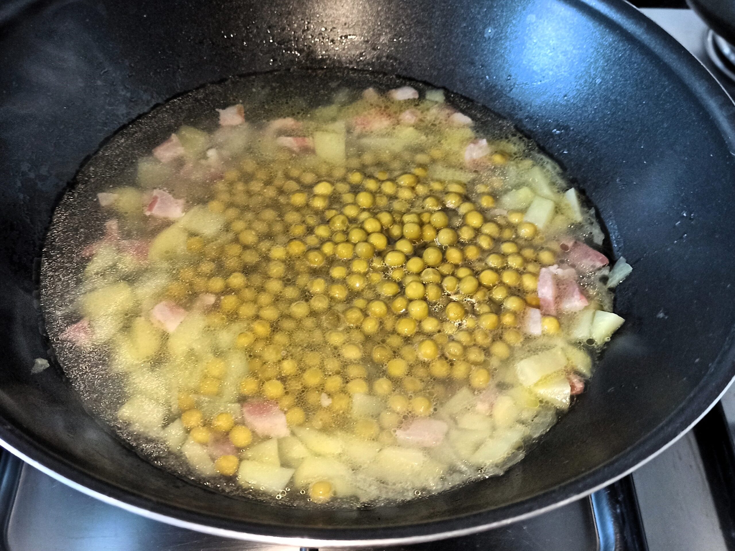 Trascorso questo tempo, aggiungete i piselli, regolate di sale e continuate la cottura per venti minuti, se occorre aggiungete altra acqua.