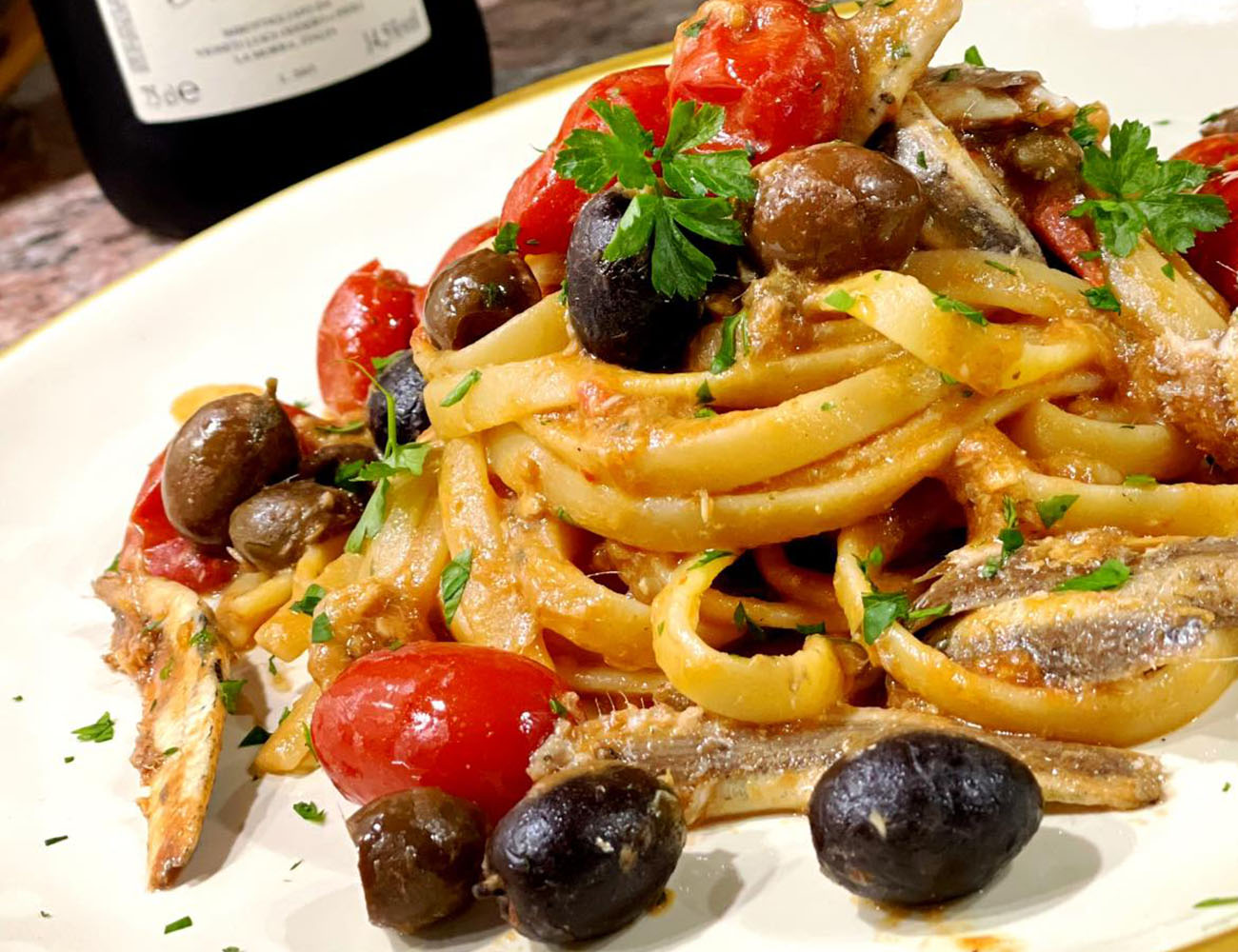 Fate insaporire per altri due minuti. Aggiungete i pomodorini che avete precedentemente lavato e tagliato a pezzi. Aggiustate di sale e lasciate cuocere il sughetto. In un’altra pentola tostate il pangrattato nell’olio extravergine di oliva bollente. Scolate la pasta molto al dente. Saltatela in padella con il sugo di pomodori e alici. Versate anche il pangrattato e mantecate il tutto a fiamma vivace. La vostra pasta struncatura è pronta. Buon appetito.