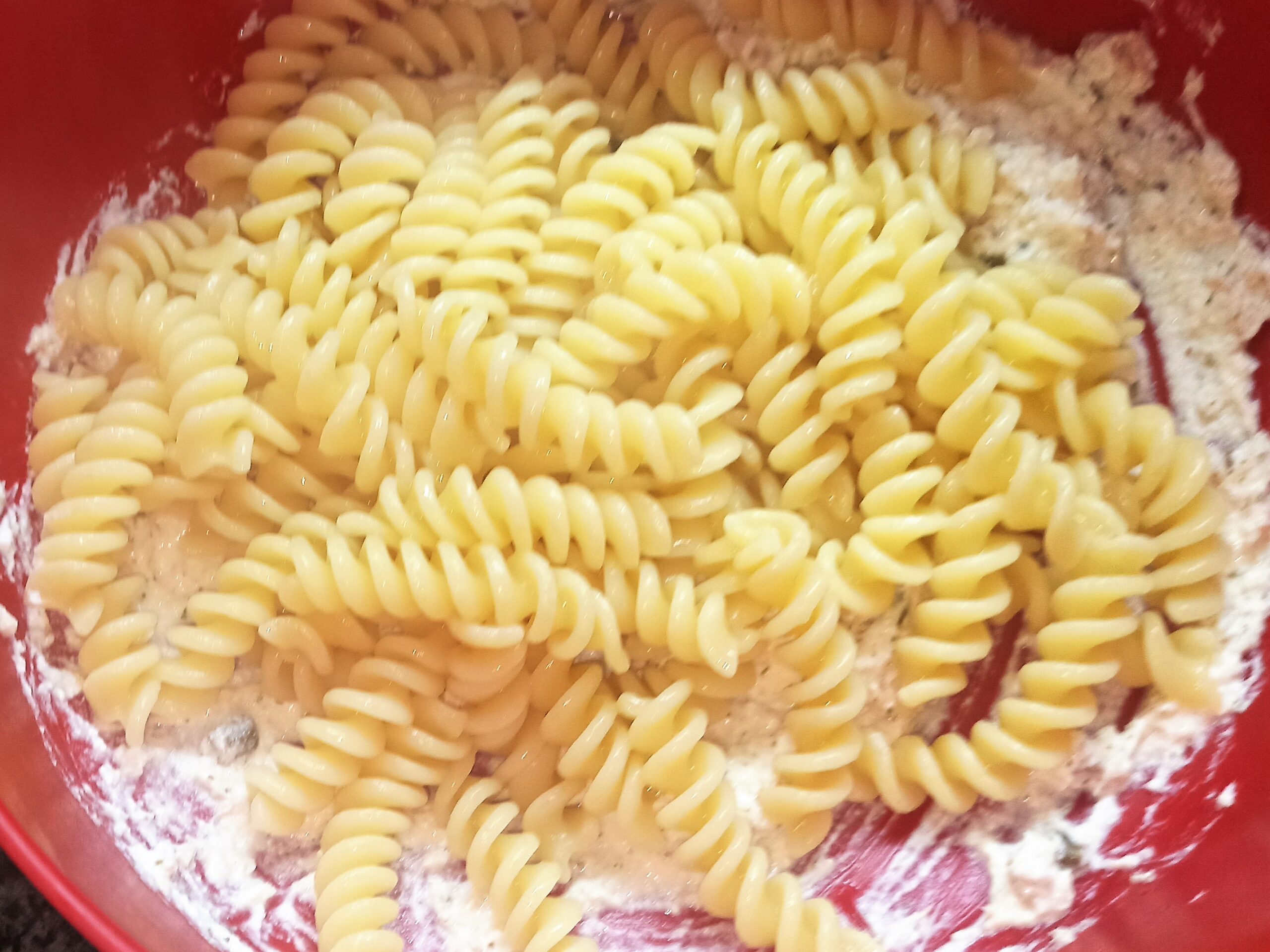 Scolate bene la pasta, poi versatela nella ciotola insieme alla crema che avete preparato, mescolate bene.