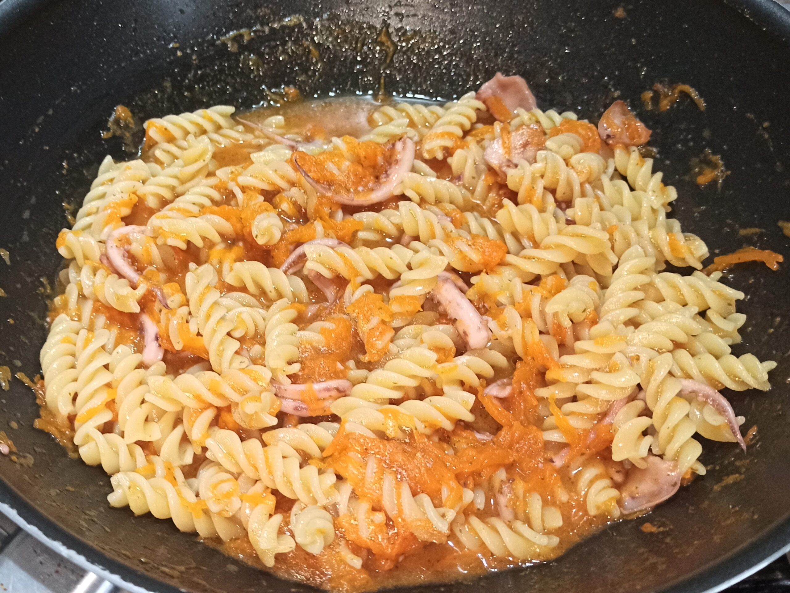 La pasta zucca e totani, è un inusuale abbinamento mare e monti. Un primo piatto dai sapori autunnali, elegante, colorato e cremoso. Da preparare per un pranzo in famiglia, o per stupire i vostri ospiti. Qualsiasi sia la finalità, vi consiglio di abbondare con la pasta, perché tutti vi chiederanno il bis. Un piatto che si prepara velocemente e con pochi ingredienti. Di seguito vi lascio la mia versione. Potete utilizzare il formato e il tipo di pasta che preferite, io ho utilizzato dei fusilli ricci corti.