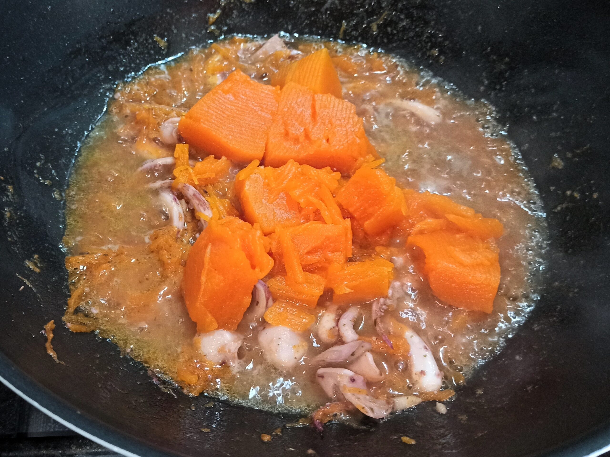 Nel frattempo che la zucca cuoce, pulite e lavate i totani, tagliateli a pezzetti e/o ad anelli.