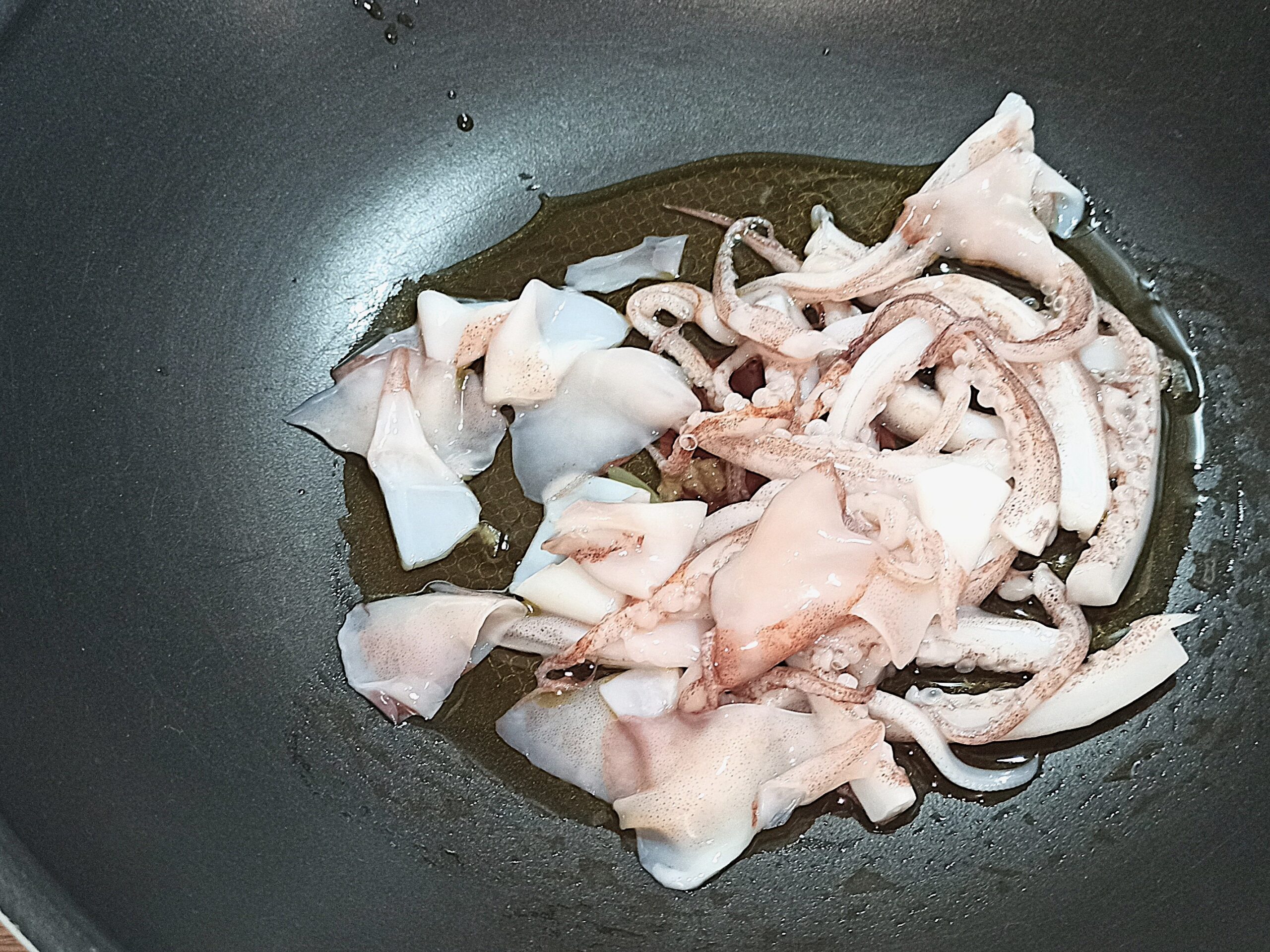 In una capiente padella mettete un paio di giri abbondanti di olio evo, e fate sfrigolare lo spicchio d’aglio. Appena sarà imbiondito eliminatelo, ed aggiungete i totani.