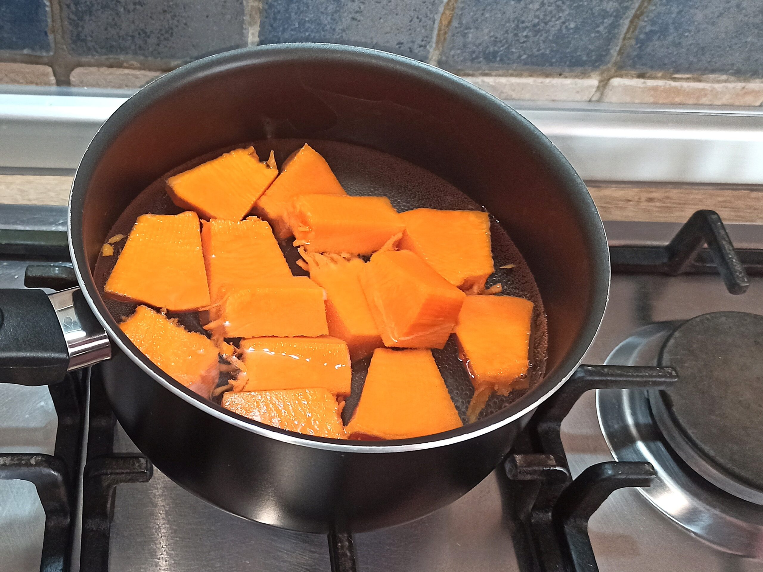 Conservate l’acqua di cottura per cuocere la pasta. Schiacciatela con l’aiuto di una forchetta, regolate di sale e fate insaporire il tutto per alcuni minuti. Iniziate la cottura della pasta direttamente nella padella, aggiungendo a bisogno l’acqua di cottura della zucca.