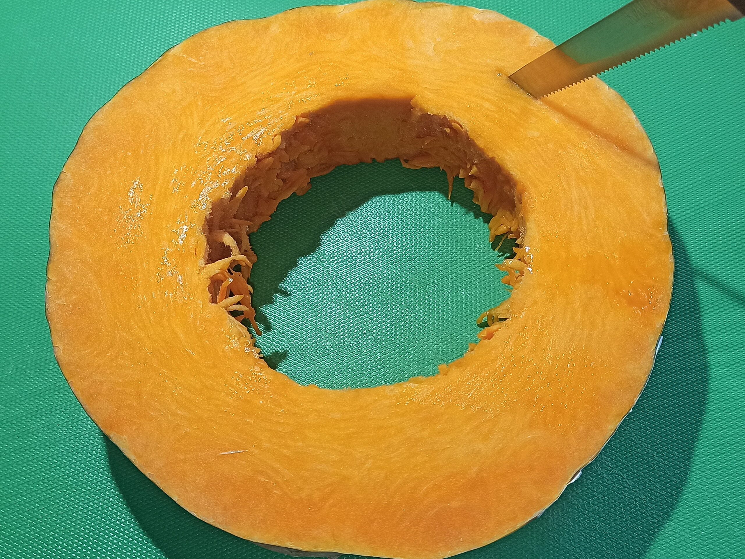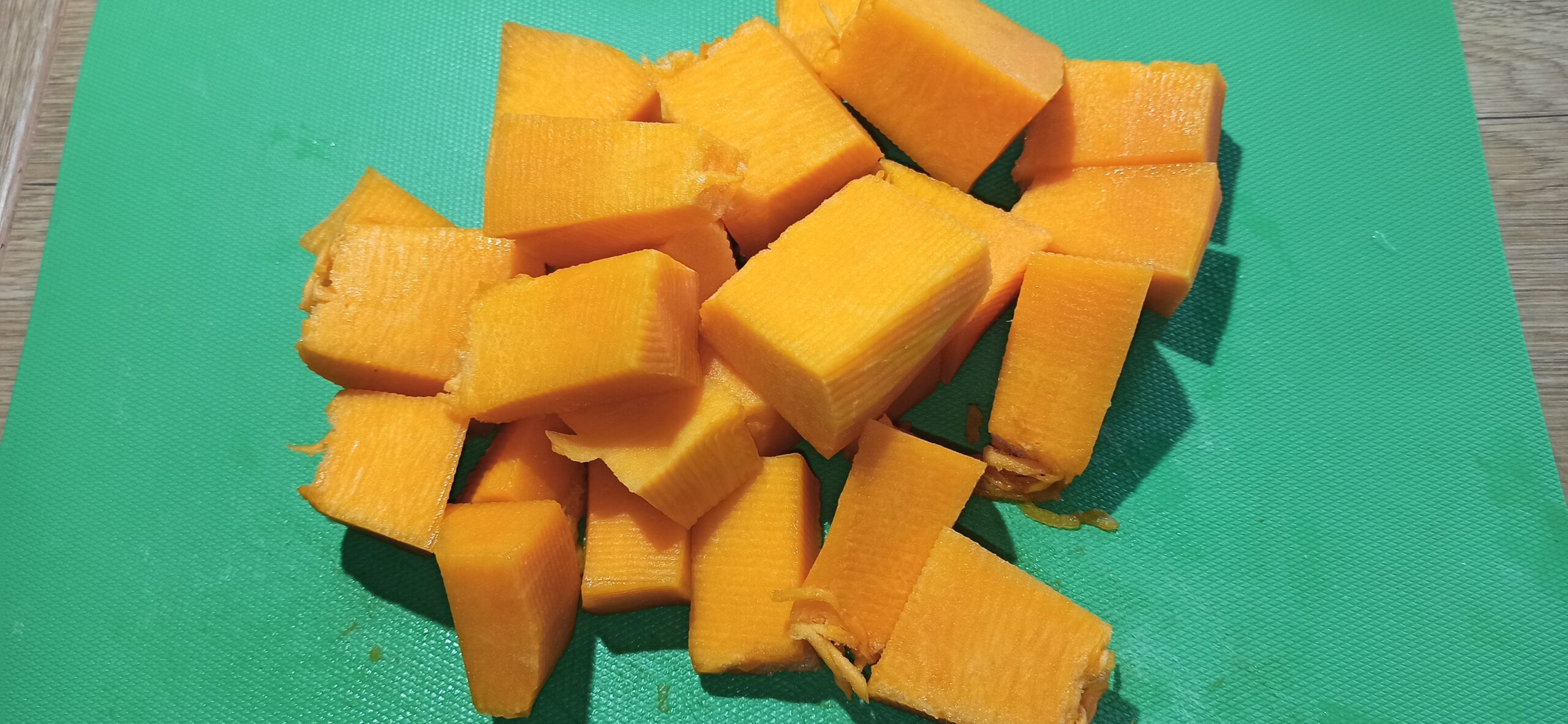 Per preparare la pasta zucca e totani, iniziate a tagliare la zucca a pezzi,