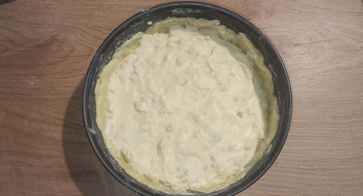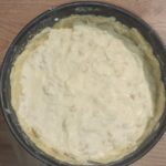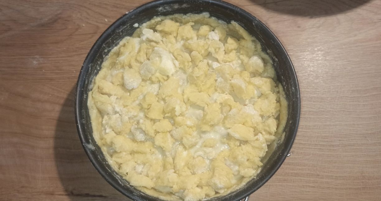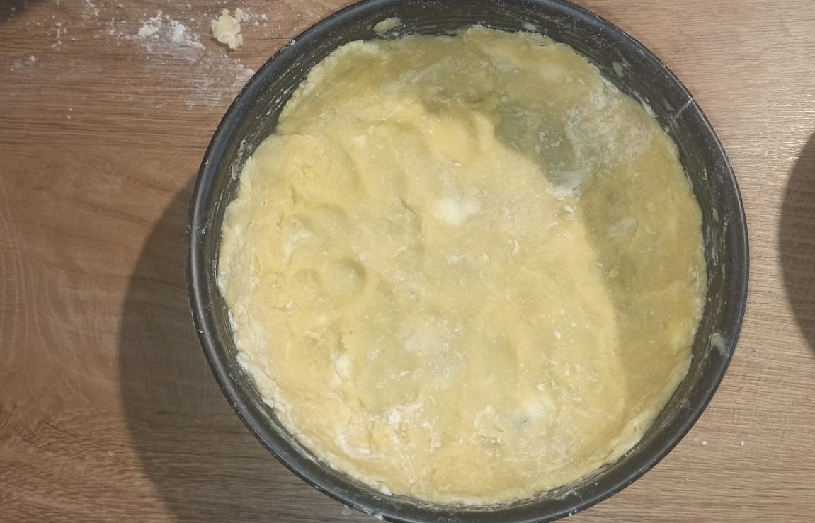 Imburrate ed infarinate una tortiera di 22 centimetri. Sbriciolate metà della pasta frolla sul fondo e sui bordi della tortiera.