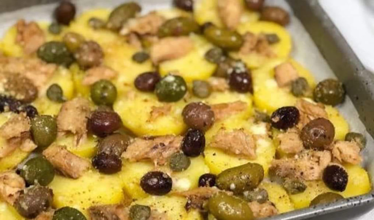 Lessare le patate (senza pelarle) in una pentola piena di acqua, dopodiché si scolano, si fanno freddare, si pelano e poi si tagliano a rondelle. Mettere in una teglia da forno la carta apposita, dopodiché ci si adagiano sopra le rondelle di patata (o i pezzetti, dipende) senza sovrapporle. Si guarniscono poi col tonno, i capperi, le olive, il pepe, il sale, il formaggio grattugiato, il pangrattato e quanto basta di olio extravergine di oliva.