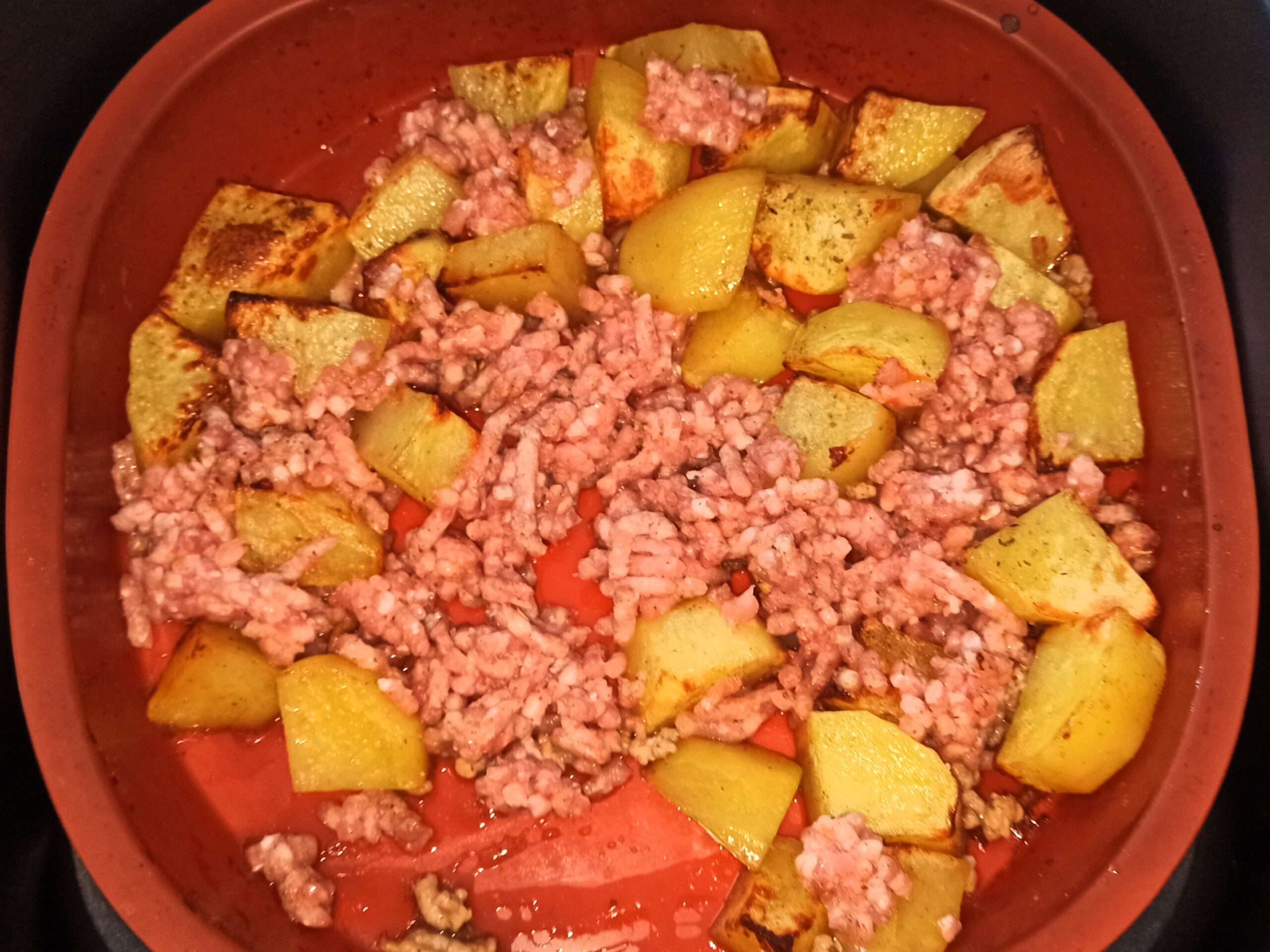 Per preparare le patate in friggitrice ad aria con briciole croccanti di carne, iniziate a pelare le patate, lavatele e tagliatele a cubettoni. Mettetele in una ciotola, aggiungete pochissimo olio evo, e gli aromi tritati finemente. Mescolate bene, e trasferitele nel cestello della friggitrice ad aria. Iniziate a cuocerle a 200° per circa dieci minuti, poi giratele e continuate la cottura per altri dieci minuti. Aggiungete la carne,