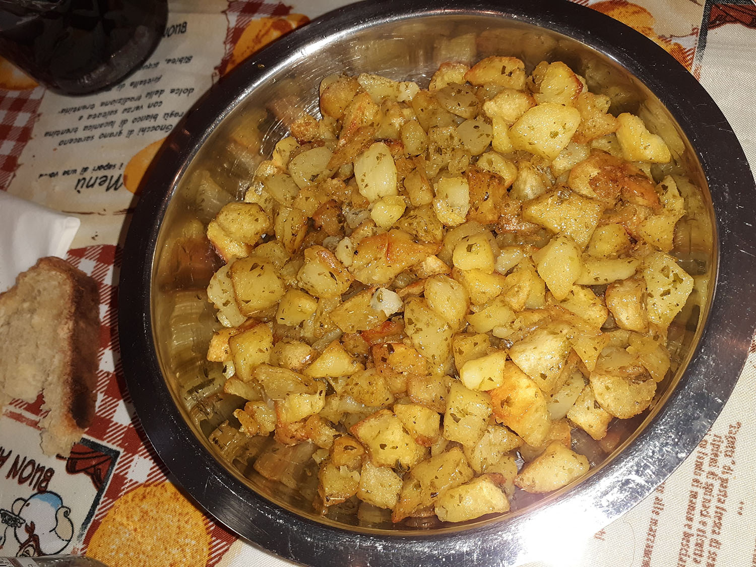 Mia nonna (poi mia mamma), dopo aver tagliato le patate, le metteva in un contenitore, tipo insalatiera, le condiva con olio, origano e le disponeva in una teglia da forno (precedentemente unta con l’olio) a cui aggiungeva poi fette di pomodoro. Aggiungeva la mollica di pane sbriciolata e condiva con olio di nuovo… Il tutto senza dosi precise. Come si suol dire “a occhio”. E la ricetta della tradizione è proprio questa, si fa ad occhio senza dosi. Si condiscono le patate tutte insieme e poi si dispongono nella pirofila ben unta.