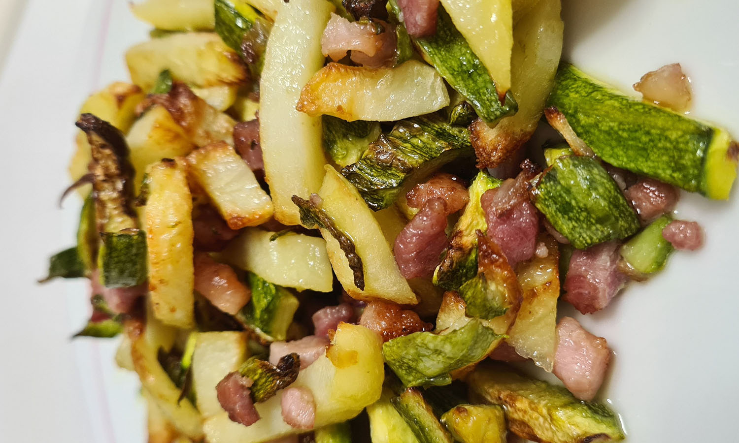 Contorno croccante con patate, zucchine, cipollotto e pancetta