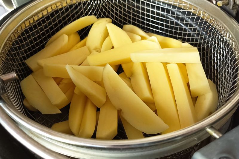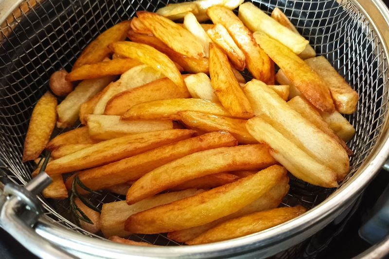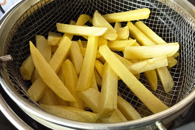nel secondo processo di frittura, lo shock termico formerà una crosticina croccante che eviterà venga assorbito altro olio dalle patate.
