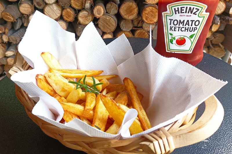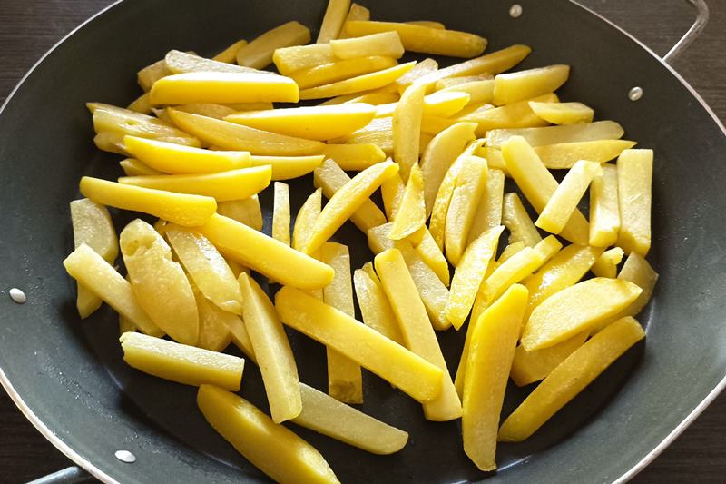 La ricetta tipica prevede la doppia frittura, le patate sono tagliate a mano e vengono fritte due volte: la prima frittura le cuoce, poi vengono raffreddate scolate dall’olio in eccesso, infine vengono fritte, al momento dell’ordine, per altri 2-3 minuti per renderle dorate e croccanti: