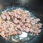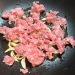 In una capiente padella, mettete un giro d’olio evo, aggiungete la cipolla, la salsiccia, e iniziate a rosolare a fiamma media.