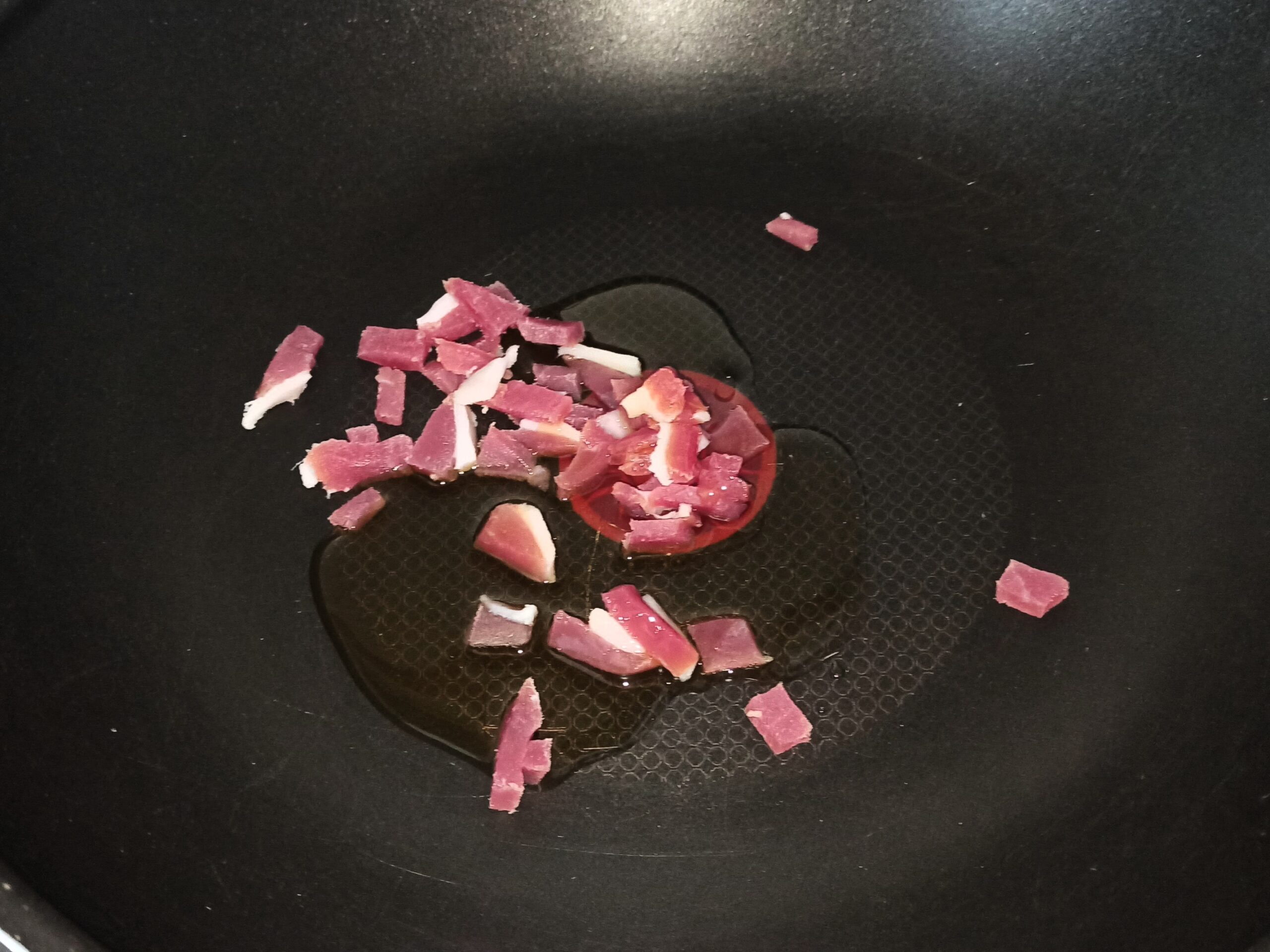 In una capiente padella, mettete un paio di giri d’olio evo, poi aggiungete lo speck, e fate rosolare per un minuto, poi sfumate con il brandy.