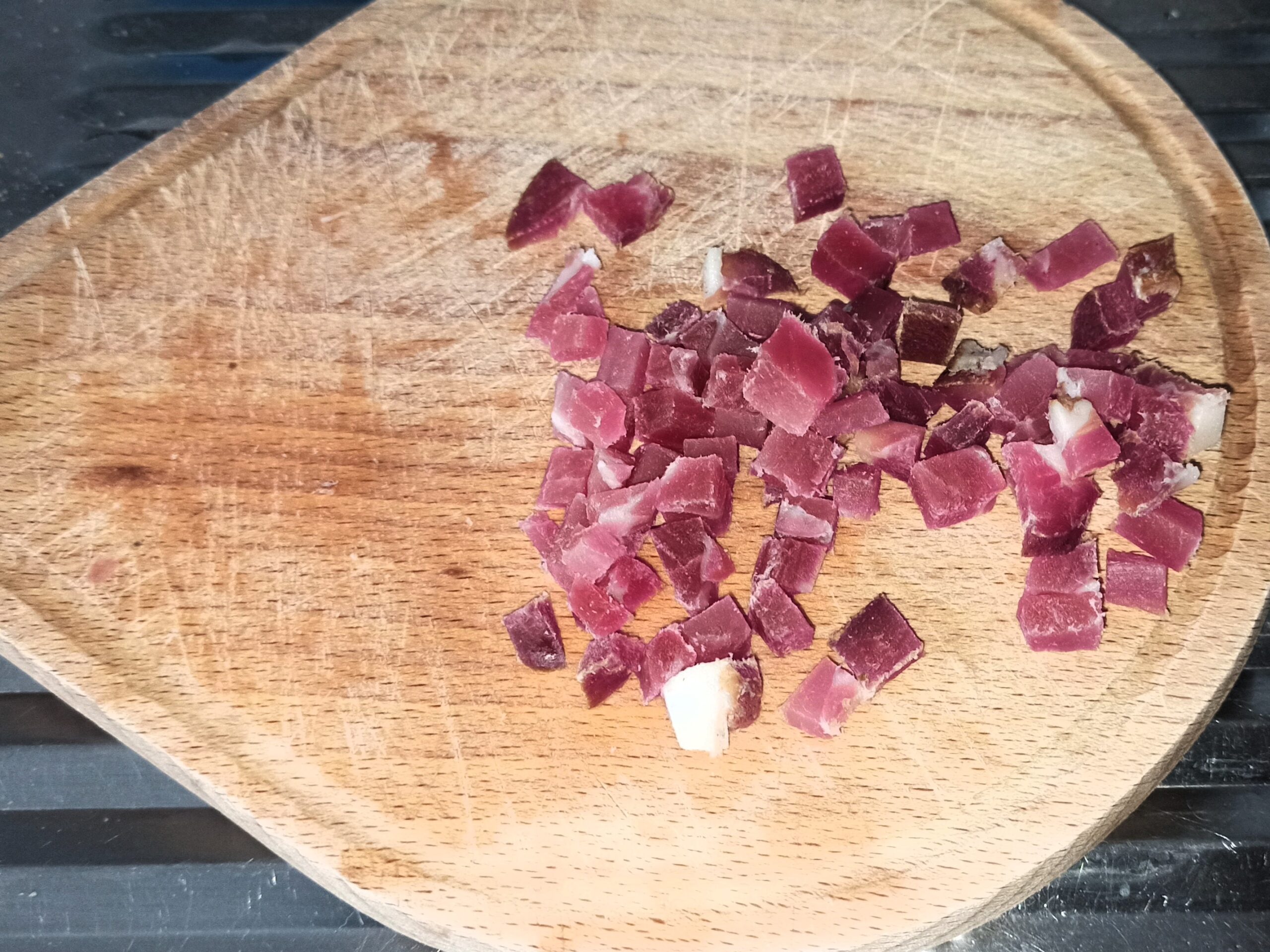 Per preparare le penne fumè, iniziate ad affettare molto sottile la cipolla, e tagliare lo speck a cubetti.