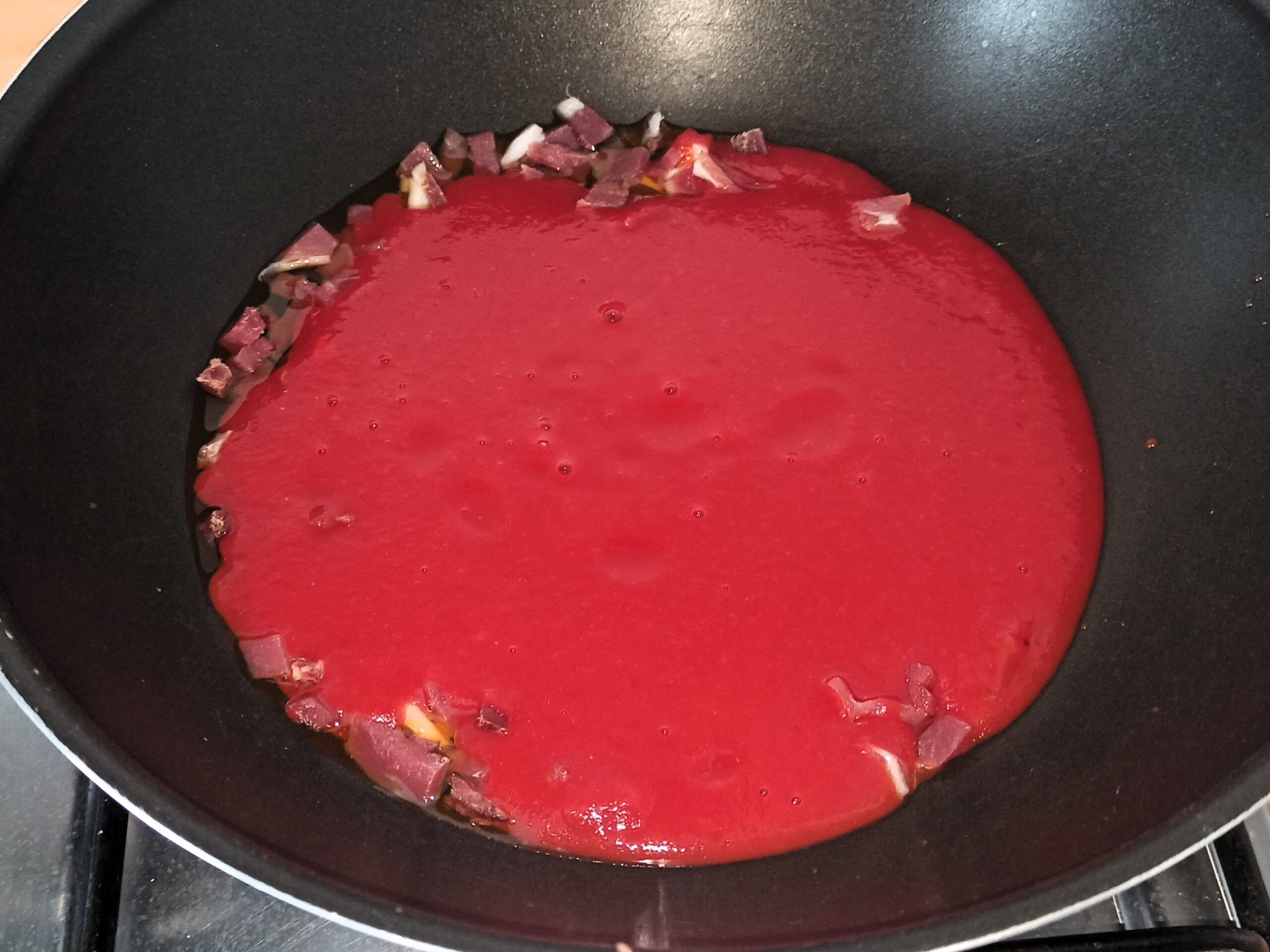 Appena l’alcol sarà evaporato, aggiungete la cipolla, fatela imbiondire, facendo attenzioni che non bruci. Aggiungete il passato di pomodoro,